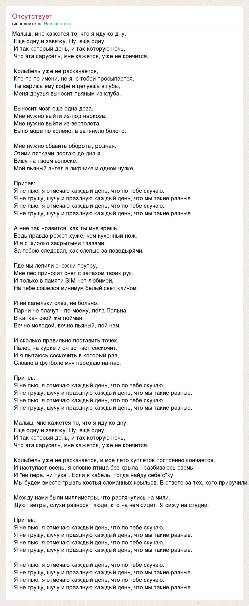 Малыш, мне кажется то, что я иду ко дну. Еще одну и завяжу. Ну, еще одну. И так который день, и так которую ночь, Что эта карусель, мне кажется, уже не кончится. Колыбель уже не раскачается, Кто-то по имени, не я, с тобой просыпается. Ты варишь ему кофе и целуешь в губы, Меня друзья выносит пьяным из клуба. Выносит мозг еще одна доза. Мне нужно выйти из-под наркоза. Мне нужно выйти из вертолета. Было море по колено, а затянуло болото. Мне нужно сбавить обороты, родная. Этими пятками достаю до дна я. Вишу на твоем волоске. Мой пьяный ангел в лифчике и одном чулке. Припев: Я не пью, я отмечаю каждый день, что по тебе скучаю. Я не грущу, шучу и праздную каждый день, что мы такие разные. Я не пью, я отмечаю каждый день, что по тебе скучаю. Я не грущу, шучу и праздную каждый день, что мы такие разные. А мне так нравится, как ты мне врешь. Ведь правда режет хуже, чем кухонный нож. И я с широко закрытыми глазами, За тобою следовал, как слепые за поводырями. Где мы лепили снежки поутру, Мне пес приносит снег с запахом твоих рук. И только в памяти SIM нет любимой, На тебе сошелся минимум белый свет клином. И ни капельки слез, не больно. Парни не плачут - по-моему, пела Польна. В капкан свой же пойман. Вечно молодой, вечно пьяный, пой нам. И сколько правильно поставить точек, Палец на курке и он вот-вот соскочит. И я пытаюсь соскочить в который раз, Словно в футболе мяч передаю на-пас. Припев: Я не пью, я отмечаю каждый день, что по тебе скучаю. Я не грущу, шучу и праздную каждый день, что мы такие разные. Я не пью, я отмечаю каждый день, что по тебе скучаю. Я не грущу, шучу и праздную каждый день, что мы такие разные. Малыш, мне кажется то, что я иду ко дну. Еще одну и завяжу. Ну, еще одну. И так который день, и так которую ночь, Что эта карусель, мне кажется, уже не кончится. Колыбель уже не раскачается, и мое лето куплетов постоянно кончается. И наступает осень, я словно птица без крыла - разбиваюсь оземь. И "ни пера, ни пуха". Если я кабель, тогда найду себе с*ку. Мы будем вместе грызть костья сломанных крыльев. В ответе за тех, кого приручили. Между нами были миллиметры, что растянулись на мили. Дуют ветры, слухи разносят люди: кто на чем сидит. Я сижу на студии. Припев: Я не пью, я отмечаю каждый день, что по тебе скучаю. Я не грущу, шучу и праздную каждый день, что мы такие разные. Я не пью, я отмечаю каждый день, что по тебе скучаю. Я не грущу, шучу и праздную каждый день, что мы такие разные. Я не пью, я отмечаю каждый день, что по тебе скучаю. Я не грущу, шучу и праздную каждый день, что мы такие разные. Я не пью, я отмечаю каждый день, что по тебе скучаю. Я не грущу, шучу и праздную каждый день, что мы такие разные.