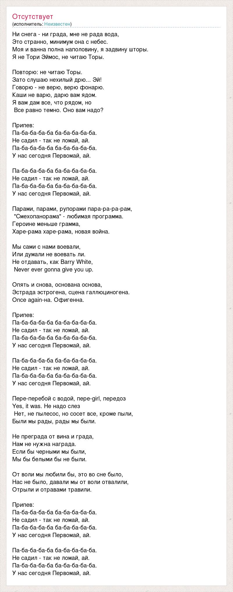 Ни снега - ни града, мне не рада вода, Это странно, минимум она с небес. Моя и ванна полна наполовину, я задвину шторы. Я не Тори Эймос, не читаю Торы. Повторю: не читаю Торы. Зато слушаю нехилый дрю... Эй! Говорю - не верю, верю фонарю. Каши не варю, дарю вам ядом. Я вам дам все, что рядом, но Все равно темно. Оно вам надо? Припев: Па-ба-ба-ба-ба ба-ба-ба-ба-ба. Не садил - так не ломай, ай. Па-ба-ба-ба-ба ба-ба-ба-ба-ба. У нас сегодня Первомай, ай. Па-ба-ба-ба-ба ба-ба-ба-ба-ба. Не садил - так не ломай, ай. Па-ба-ба-ба-ба ба-ба-ба-ба-ба. У нас сегодня Первомай, ай. Парами, парами, рупорами пара-ра-ра-рам, "Смехопанорама" - любимая программа. Героине меньше грамма, Харе-рама харе-рама, новая война. Мы сами с нами воевали, Или думали не воевать ли. Не отдавать, как Barry White, Never ever gonna give you up. Опять и снова, основана основа, Эстрада эстрогена, сцена галлюциногена. Once again-на. Офигенна. Припев: Па-ба-ба-ба-ба ба-ба-ба-ба-ба. Не садил - так не ломай, ай. Па-ба-ба-ба-ба ба-ба-ба-ба-ба. У нас сегодня Первомай, ай. Па-ба-ба-ба-ба ба-ба-ба-ба-ба. Не садил - так не ломай, ай. Па-ба-ба-ба-ба ба-ба-ба-ба-ба. У нас сегодня Первомай, ай. Пере-перебой с водой, пере-girl, передоз Yes, it was. Не надо слез Нет, не пылесос, но сосет все, кроме пыли, Были мы рады, рады мы были. Не преграда от вина и града, Нам не нужна награда. Если бы черными мы были, Мы бы белыми бы не были. От воли мы любили бы, это во сне было, Нас не было, давали мы от воли отвалили, Отрыли и отравами травили. Припев: Па-ба-ба-ба-ба ба-ба-ба-ба-ба. Не садил - так не ломай, ай. Па-ба-ба-ба-ба ба-ба-ба-ба-ба. У нас сегодня Первомай, ай. Па-ба-ба-ба-ба ба-ба-ба-ба-ба. Не садил - так не ломай, ай. Па-ба-ба-ба-ба ба-ба-ба-ба-ба. У нас сегодня Первомай, ай.