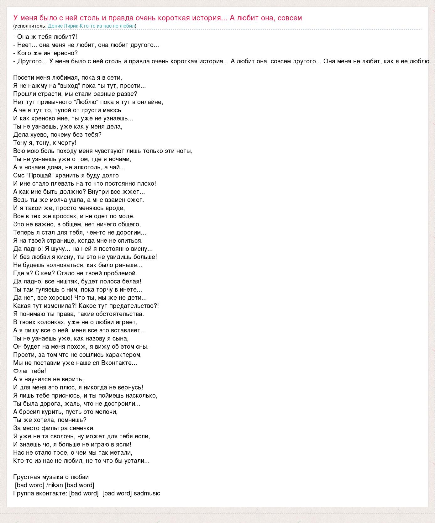 - Она ж тебя любит?! - Неет... она меня не любит, она любит другого... - Кого же интересно? - Другого... У меня было с ней столь и правда очень короткая история... А любит она, совсем другого... Она меня не любит, как я ее люблю... Посети меня любимая, пока я в сети, Я не нажму на "выход" пока ты тут, прости... Прошли страсти, мы стали разные разве? Нет тут привычного "Люблю" пока я тут в онлайне, А че я тут то, тупой от грусти маюсь И как хреново мне, ты уже не узнаешь... Ты не узнаешь, уже как у меня дела, Дела хуево, почему без тебя? Тону я, тону, к черту! Всю мою боль походу меня чувствуют лишь только эти ноты, Ты не узнаешь уже о том, где я ночами, А я ночами дома, не алкоголь, а чай... Смс "Прощай" хранить я буду долго И мне стало плевать на то что постоянно плохо! А как мне быть должно? Внутри все жжет... Ведь ты же молча ушла, а мне взамен ожег. И я такой же, просто меняюсь вроде, Все в тех же кроссах, и не одет по моде. Это не важно, в общем, нет ничего общего, Теперь я стал для тебя, чем-то не дорогим... Я на твоей странице, когда мне не спиться. Да ладно! Я шучу... на ней я постоянно висну... И без любви я кисну, ты это не увидишь больше! Не будешь волноваться, как было раньше... Где я? С кем? Стало не твоей проблемой. Да ладно, все ништяк, будет полоса белая! Ты там гуляешь с ним, пока торчу в инете... Да нет, все хорошо! Что ты, мы же не дети... Какая тут изменила?! Какое тут предательство?! Я понимаю ты права, такие обстоятельства. В твоих колонках, уже не о любви играет, А я пишу все о ней, меня все это вставляет... Ты не узнаешь уже, как назову я сына, Он будет на меня похож, я вижу об этом сны. Прости, за том что не сошлись характером, Мы не поставим уже наше сп Вконтакте... Флаг тебе! А я научился не верить, И для меня это плюс, я никогда не вернусь! Я лишь тебе приснюсь, и ты поймешь насколько, Ты была дорога, жаль, что не достроили... А бросил курить, пусть это мелочи, Ты же хотела, помнишь? За место фильтра семечки. Я уже не та сволочь, ну может для тебя если, И знаешь чо, я больше не играю в ясли! Нас не стало трое, о чем мы так метали, Кто-то из нас не любил, не то что бы устали... Грустная музыка о любви [bad word] /nikan [bad word] Группа вконтакте: [bad word] [bad word] sadmusic