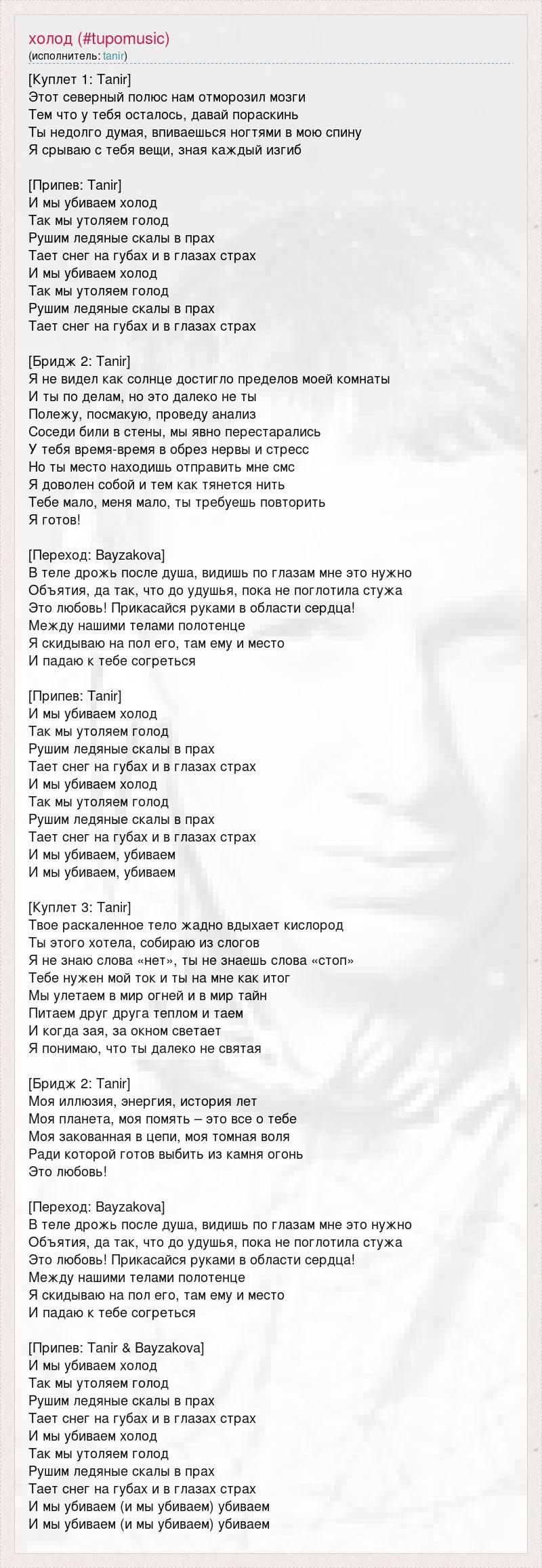 [Куплет 1: Tanir] Этот северный полюс нам отморозил мозги Тем что у тебя осталось, давай пораскинь Ты недолго думая, впиваешься ногтями в мою спину Я срываю с тебя вещи, зная каждый изгиб [Припев: Tanir] И мы убиваем холод Так мы утоляем голод Рушим ледяные скалы в прах Тает снег на губах и в глазах страх И мы убиваем холод Так мы утоляем голод Рушим ледяные скалы в прах Тает снег на губах и в глазах страх [Бридж 2: Tanir] Я не видел как солнце достигло пределов моей комнаты И ты по делам, но это далеко не ты Полежу, посмакую, проведу анализ Соседи били в стены, мы явно перестарались У тебя время-время в обрез нервы и стресс Но ты место находишь отправить мне смс Я доволен собой и тем как тянется нить Тебе мало, меня мало, ты требуешь повторить Я готов! [Переход: Bayzakova] В теле дрожь после душа, видишь по глазам мне это нужно Объятия, да так, что до удушья, пока не поглотила стужа Это любовь! Прикасайся руками в области сердца! Между нашими телами полотенце Я скидываю на пол его, там ему и место И падаю к тебе согреться [Припев: Tanir] И мы убиваем холод Так мы утоляем голод Рушим ледяные скалы в прах Тает снег на губах и в глазах страх И мы убиваем холод Так мы утоляем голод Рушим ледяные скалы в прах Тает снег на губах и в глазах страх И мы убиваем, убиваем И мы убиваем, убиваем [Куплет 3: Tanir] Твое раскаленное тело жадно вдыхает кислород Ты этого хотела, собираю из слогов Я не знаю слова «нет», ты не знаешь слова «стоп» Тебе нужен мой ток и ты на мне как итог Мы улетаем в мир огней и в мир тайн Питаем друг друга теплом и таем И когда зая, за окном светает Я понимаю, что ты далеко не святая [Бридж 2: Tanir] Моя иллюзия, энергия, история лет Моя планета, моя помять – это все о тебе Моя закованная в цепи, моя томная воля Ради которой готов выбить из камня огонь Это любовь! [Переход: Bayzakova] В теле дрожь после душа, видишь по глазам мне это нужно Объятия, да так, что до удушья, пока не поглотила стужа Это любовь! Прикасайся руками в области сердца! Между нашими телами полотенце Я скидываю на пол его, там ему и место И падаю к тебе согреться [Припев: Tanir & Bayzakova] И мы убиваем холод Так мы утоляем голод Рушим ледяные скалы в прах Тает снег на губах и в глазах страх И мы убиваем холод Так мы утоляем голод Рушим ледяные скалы в прах Тает снег на губах и в глазах страх И мы убиваем (и мы убиваем) убиваем И мы убиваем (и мы убиваем) убиваем