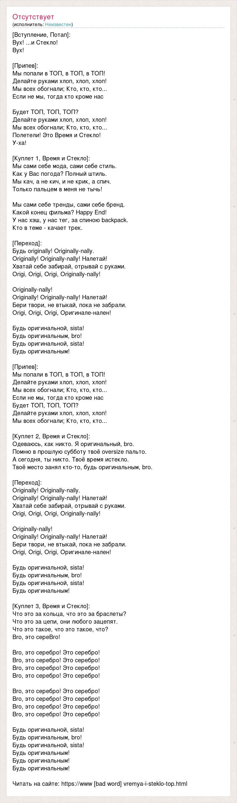 [Вступление, Потап]: Вух! ...и Стекло! Вух! [Припев]: Мы попали в ТОП, в ТОП, в ТОП! Делайте руками хлоп, хлоп, хлоп! Мы всех обогнали; Кто, кто, кто... Если не мы, тогда кто кроме нас Будет ТОП, ТОП, ТОП? Делайте руками хлоп, хлоп, хлоп! Мы всех обогнали; Кто, кто, кто... Полетели! Это Время и Стекло! У-ха! [Куплет 1, Время и Стекло]: Мы сами себе мода, сами себе стиль. Как у Вас погода? Полный штиль. Мы кач, а не кич, и не крик, а спич. Только пальцем в меня не тычь! Мы сами себе тренды, сами себе бренд. Какой конец фильма? Happy End! У нас хэш, у нас тег, за спиною backpack. Кто в теме - качает трек. [Переход]: Будь originally! Originally-nally. Originally! Originally-nally! Налетай! Хватай себе забирай, отрывай с руками. Origi, Origi, Origi, Originally-nally! Originally-nally! Originally! Originally-nally! Налетай! Бери твори, не втыкай, пока не забрали. Origi, Origi, Origi, Оригинале-нален! Будь оригинальной, sista! Будь оригинальным, bro! Будь оригинальной, sista! Будь оригинальным! [Припев]: Мы попали в ТОП, в ТОП, в ТОП! Делайте руками хлоп, хлоп, хлоп! Мы всех обогнали; Кто, кто, кто... Если не мы, тогда кто кроме нас Будет ТОП, ТОП, ТОП? Делайте руками хлоп, хлоп, хлоп! Мы всех обогнали; Кто, кто, кто... [Куплет 2, Время и Стекло]: Одеваюсь, как никто. Я оригинальный, bro. Помню в прошлую субботу твоё oversize пальто. А сегодня, ты никто. Твоё время истекло. Твоё место занял кто-то, будь оригинальным, bro. [Переход]: Originally! Originally-nally. Originally! Originally-nally! Налетай! Хватай себе забирай, отрывай с руками. Origi, Origi, Origi, Originally-nally! Originally-nally! Originally! Originally-nally! Налетай! Бери твори, не втыкай, пока не забрали. Origi, Origi, Origi, Оригинале-нален! Будь оригинальной, sista! Будь оригинальным, bro! Будь оригинальной, sista! Будь оригинальным! [Куплет 3, Время и Стекло]: Что это за кольца, что это за браслеты? Что это за цепи, они любого зацепят. Что это такое, что это такое, что? Bro, это сереBro! Bro, это серебро! Это серебро! Bro, это серебро! Это серебро! Bro, это серебро! Это серебро! Bro, это серебро! Это серебро! Bro, это серебро! Это серебро! Bro, это серебро! Это серебро! Bro, это серебро! Это серебро! Bro, это серебро! Это серебро! Будь оригинальной, sista! Будь оригинальным, bro! Будь оригинальной, sista! Будь оригинальным! Будь оригинальным! Будь оригинальным! Читать на сайте: https://www [bad word] vremya-i-steklo-top.html