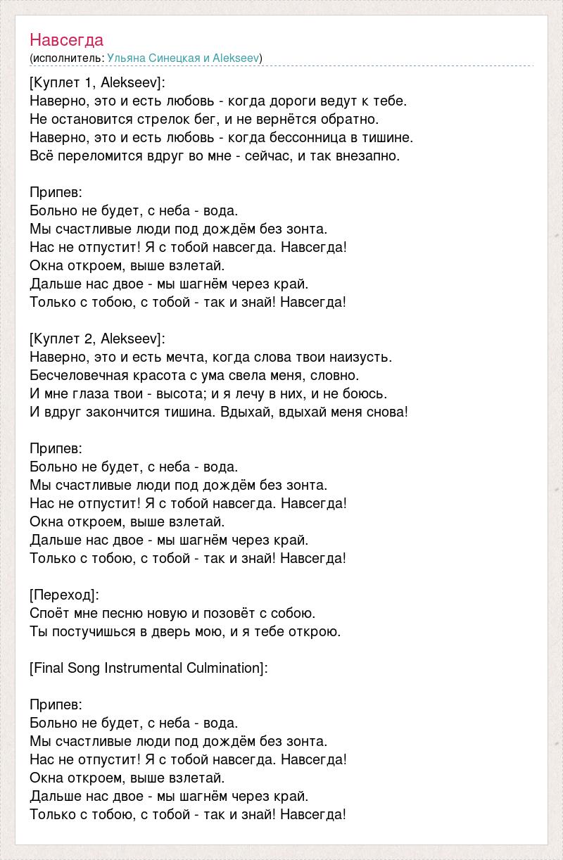 [Куплет 1, Alekseev]: Наверно, это и есть любовь - когда дороги ведут к тебе. Не остановится стрелок бег, и не вернётся обратно. Наверно, это и есть любовь - когда бессонница в тишине. Всё переломится вдруг во мне - сейчас, и так внезапно. Припев: Больно не будет, с неба - вода. Мы счастливые люди под дождём без зонта. Нас не отпустит! Я с тобой навсегда. Навсегда! Окна откроем, выше взлетай. Дальше нас двое - мы шагнём через край. Только с тобою, с тобой - так и знай! Навсегда! [Куплет 2, Alekseev]: Наверно, это и есть мечта, когда слова твои наизусть. Бесчеловечная красота с ума свела меня, словно. И мне глаза твои - высота; и я лечу в них, и не боюсь. И вдруг закончится тишина. Вдыхай, вдыхай меня снова! Припев: Больно не будет, с неба - вода. Мы счастливые люди под дождём без зонта. Нас не отпустит! Я с тобой навсегда. Навсегда! Окна откроем, выше взлетай. Дальше нас двое - мы шагнём через край. Только с тобою, с тобой - так и знай! Навсегда! [Переход]: Споёт мне песню новую и позовёт с собою. Ты постучишься в дверь мою, и я тебе открою. [Final Song Instrumental Culmination]: Припев: Больно не будет, с неба - вода. Мы счастливые люди под дождём без зонта. Нас не отпустит! Я с тобой навсегда. Навсегда! Окна откроем, выше взлетай. Дальше нас двое - мы шагнём через край. Только с тобою, с тобой - так и знай! Навсегда!