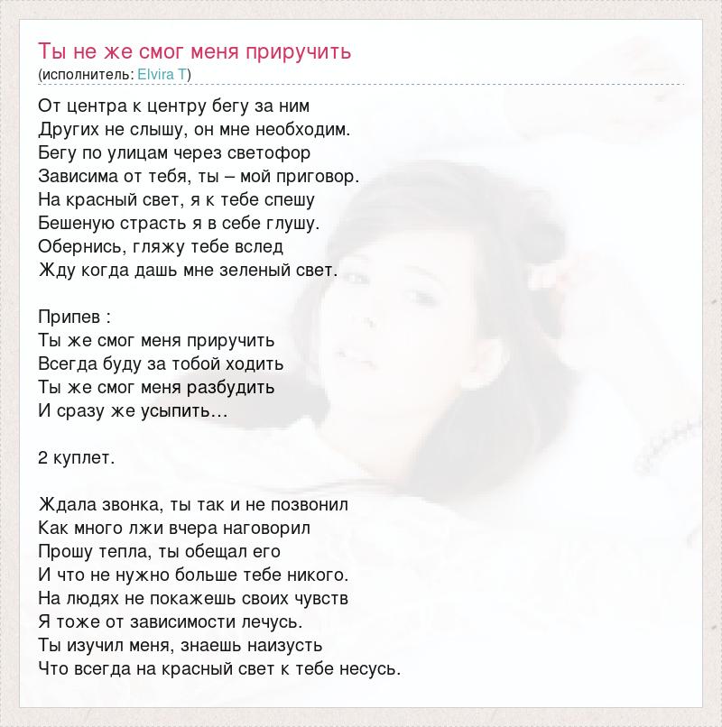 От центра к центру бегу за ним Других не слышу, он мне необходим. Бегу по улицам через светофор Зависима от тебя, ты – мой приговор. На красный свет, я к тебе спешу Бешеную страсть я в себе глушу. Обернись, гляжу тебе вслед Жду когда дашь мне зеленый свет. Припев : Ты же смог меня приручить Всегда буду за тобой ходить Ты же смог меня разбудить И сразу же усыпить… 2 куплет. Ждала звонка, ты так и не позвонил Как много лжи вчера наговорил Прошу тепла, ты обещал его И что не нужно больше тебе никого. На людях не покажешь своих чувств Я тоже от зависимости лечусь. Ты изучил меня, знаешь наизусть Что всегда на красный свет к тебе несусь.