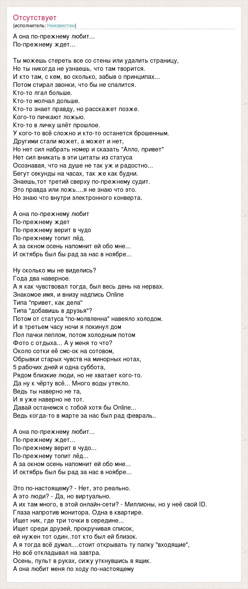 А она по-прежнему любит... По-прежнему ждет... Ты можешь стереть все со стены или удалить страницу, Но ты никогда не узнаешь, что там творится. И кто там, с кем, во сколько, забыв о принципах... Потом стирал звонки, что бы не спалится. Кто-то лгал больше. Кто-то молчал дольше. Кто-то знает правду, но расскажет позже. Кого-то пичкают ложью. Кто-то в личку шлёт прошлое. У кого-то всё сложно и кто-то останется брошенным. Другими стали может, а может и нет, Но нет сил набрать номер и сказать "Алло, привет" Нет сил вникать в эти цитаты из статуса Осознавая, что на душе не так уж и радостно... Бегут секунды на часах, так же как будни. Знаешь,тот третий сверху по-прежнему судит. Это правда или ложь....я не знаю что это. Но знаю что внутри электронного конверта. А она по-прежнему любит По-прежнему ждет По-прежнему верит в чудо По-прежнему топит лёд. А за окном осень напомнит ей обо мне... И октябрь был бы рад за нас в ноябре... Ну сколько мы не виделись? Года два наверное. А я как чувствовал тогда, был весь день на нервах. Знакомое имя, и внизу надпись Online Типа "привет, как дела" Типа "добавишь в друзья"? Потом от статуса "по-молвленна" навеяло холодом. И в третьем часу ночи я покинул дом Пол пачки пеплом, потом холодным потом Фото с отдыха... А у меня то что? Около сотки её смс-ок на сотовом, Обрывки старых чувств на минорных нотах, 5 рабочих дней и одна суббота, Рядом близкие люди, но не хватает кого-то. Да ну к чёрту всё... Много воды утекло. Ведь ты наверно не та, И я уже наверно не тот. Давай останемся с тобой хотя бы Online... Ведь когда-то в марте за нас был рад февраль.. А она по-прежнему любит... По-прежнему ждет... По-прежнему верит в чудо... По-прежнему топит лёд... А за окном осень напомнит ей обо мне... И октябрь был бы рад за нас в ноябре... Это по-настоящему? - Нет, это реально. А это люди? - Да, но виртуально. А их там много, в этой онлайн-сети? - Миллионы, но у неё свой ID. Глаза напротив монитора. Одна в квартире. Ищет ник, где три точки в середине... Ищет среди друзей, прокручивая список, ей нужен тот один..тот кто был ей близок. А я тогда всё думал....стоит открывать ту папку "входящие", Но всё откладывал на завтра. Осень, пульт в руках, сижу уткнувшись в ящик. А она любит меня по ходу по-настоящему