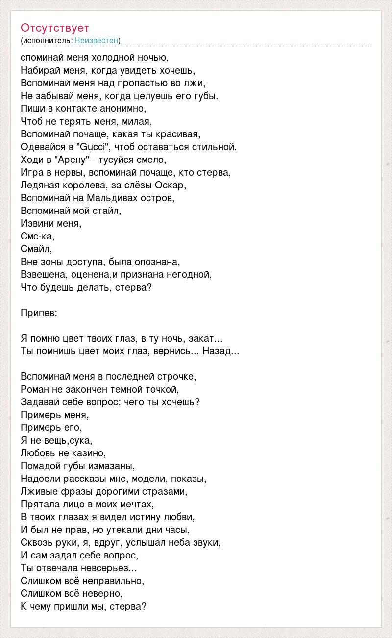 споминай меня холодной ночью, Набирай меня, когда увидеть хочешь, Вспоминай меня над пропастью во лжи, Не забывай меня, когда целуешь его губы. Пиши в контакте анонимно, Чтоб не терять меня, милая, Вспоминай почаще, какая ты красивая, Одевайся в "Gucci", чтоб оставаться стильной. Ходи в "Арену" - тусуйся смело, Игра в нервы, вспоминай почаще, кто стерва, Ледяная королева, за слёзы Оскар, Вспоминай на Мальдивах остров, Вспоминай мой стайл, Извини меня, Смс-ка, Смайл, Вне зоны доступа, была опознана, Взвешена, оценена,и признана негодной, Что будешь делать, стерва? Припев: Я помню цвет твоих глаз, в ту ночь, закат... Ты помнишь цвет моих глаз, вернись... Назад... Вспоминай меня в последней строчке, Роман не закончен темной точкой, Задавай себе вопрос: чего ты хочешь? Примерь меня, Примерь его, Я не вещь,сука, Любовь не казино, Помадой губы измазаны, Надоели рассказы мне, модели, показы, Лживые фразы дорогими стразами, Прятала лицо в моих мечтах, В твоих глазах я видел истину любви, И был не прав, но утекали дни часы, Сквозь руки, я, вдруг, услышал неба звуки, И сам задал себе вопрос, Ты отвечала невсерьез... Слишком всё неправильно, Слишком всё неверно, К чему пришли мы, стерва?