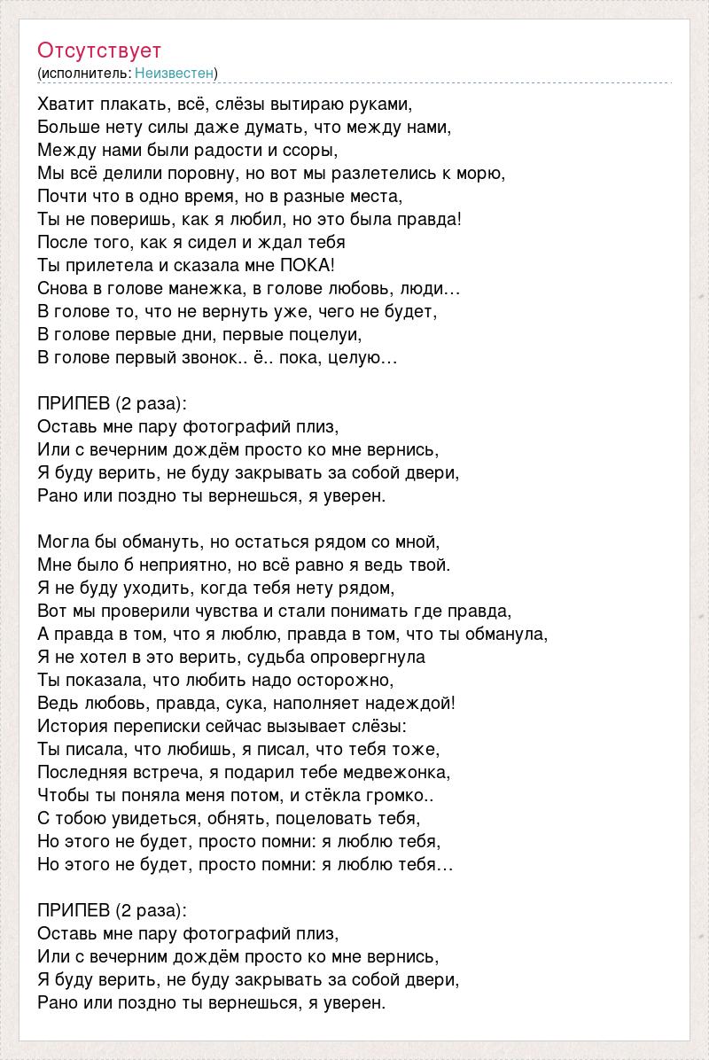 Хватит плакать, всё, слёзы вытираю руками, Больше нету силы даже думать, что между нами, Между нами были радости и ссоры, Мы всё делили поровну, но вот мы разлетелись к морю, Почти что в одно время, но в разные места, Ты не поверишь, как я любил, но это была правда! После того, как я сидел и ждал тебя Ты прилетела и сказала мне ПОКА! Снова в голове манежка, в голове любовь, люди… В голове то, что не вернуть уже, чего не будет, В голове первые дни, первые поцелуи, В голове первый звонок.. ё.. пока, целую… ПРИПЕВ (2 раза): Оставь мне пару фотографий плиз, Или с вечерним дождём просто ко мне вернись, Я буду верить, не буду закрывать за собой двери, Рано или поздно ты вернешься, я уверен. Могла бы обмануть, но остаться рядом со мной, Мне было б неприятно, но всё равно я ведь твой. Я не буду уходить, когда тебя нету рядом, Вот мы проверили чувства и стали понимать где правда, А правда в том, что я люблю, правда в том, что ты обманула, Я не хотел в это верить, судьба опровергнула Ты показала, что любить надо осторожно, Ведь любовь, правда, сука, наполняет надеждой! История переписки сейчас вызывает слёзы: Ты писала, что любишь, я писал, что тебя тоже, Последняя встреча, я подарил тебе медвежонка, Чтобы ты поняла меня потом, и стёкла громко.. С тобою увидеться, обнять, поцеловать тебя, Но этого не будет, просто помни: я люблю тебя, Но этого не будет, просто помни: я люблю тебя… ПРИПЕВ (2 раза): Оставь мне пару фотографий плиз, Или с вечерним дождём просто ко мне вернись, Я буду верить, не буду закрывать за собой двери, Рано или поздно ты вернешься, я уверен.
