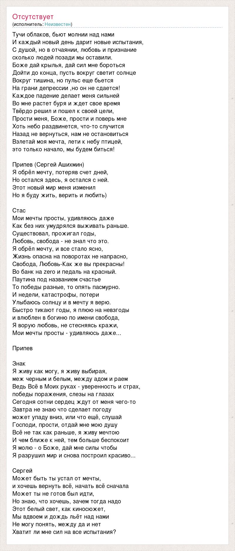Тучи облаков, бьют молнии над нами И каждый новый день дарит новые испытания, С душой, но в отчаянии, любовь и признание сколько людей позади мы оставили. Боже дай крылья, дай сил мне бороться Дойти до конца, пусть вокруг светит солнце Вокруг тишина, но пульс еще бьется На грани депрессии ,но он не сдается! Каждое падение делает меня сильней Во мне растет буря и ждет свое время Твёрдо решил и пошел к своей цели, Прости меня, Боже, прости и поверь мне Хоть небо раздвинется, что-то случится Назад не вернуться, нам не остановиться Взлетай моя мечта, лети к небу птицей, это только начало, мы будем биться! Припев (Сергей Ашихмин) Я обрёл мечту, потеряв счет дней, Но остался здесь, я остался с ней. Этот новый мир меня изменил Но я буду жить, верить и любить) Стас Мои мечты просты, удивляюсь даже Как без них умудрялся выживать раньше. Существовал, прожигал годы, Любовь, свобода - не знал что это. Я обрёл мечту, и все стало ясно, Жизнь опасна на поворотах не напрасно, Свобода, Любовь-Как же вы прекрасны! Во банк на zero и педаль на красный. Паутина под названием счастье То победы разные, то опять пасмурно. И недели, катастрофы, потери Улыбаюсь солнцу и в мечту я верю. Быстро тикают годы, я плюю на невзгоды и влюблен в богиню по имени свобода, Я ворую любовь, не стесняясь кражи, Мои мечты просты - удивляюсь даже... Припев Знак Я живу как могу, я живу выбирая, меж черным и белым, между адом и раем Ведь Всё в Моих руках - уверенность и страх, победы поражения, слезы на глазах Сегодня сотни сердец ждут от меня чего-то Завтра не знаю что сделает погоду может упаду вниз, или что ещё, слушай Господи, прости, отдай мне мою душу Всё не так как раньше, я живу мечтою И чем ближе к ней, тем больше беспокоит Я молю - о Боже, дай мне силы чтобы Я разрушил мир и снова построил красиво... Сергей Может быть ты устал от мечты, и хочешь вернуть всё, начать всё сначала Может ты не готов был идти, Но знаю, что хочешь, зачем тогда надо Этот белый свет, как киносюжет, Мы вдвоем и дождь льёт над нами Не могу понять, между да и нет Хватит ли мне сил на все испытания?