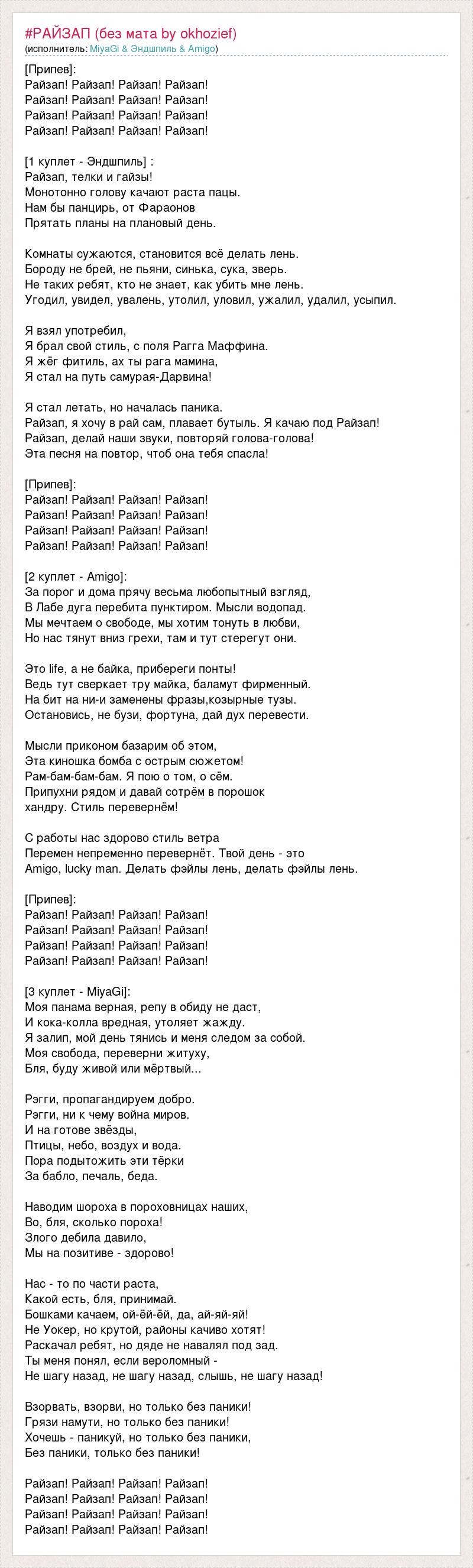 [Припев]: Райзап! Райзап! Райзап! Райзап! Райзап! Райзап! Райзап! Райзап! Райзап! Райзап! Райзап! Райзап! Райзап! Райзап! Райзап! Райзап! [1 куплет - Эндшпиль] : Райзап, телки и гайзы! Монотонно голову качают раста пацы. Нам бы панцирь, от Фараонов Прятать планы на плановый день. Комнаты сужаются, становится всё делать лень. Бороду не брей, не пьяни, синька, сука, зверь. Не таких ребят, кто не знает, как убить мне лень. Угодил, увидел, увалень, утолил, уловил, ужалил, удалил, усыпил. Я взял употребил, Я брал свой стиль, с поля Рагга Маффина. Я жёг фитиль, ах ты рага мамина, Я стал на путь самурая-Дарвина! Я стал летать, но началась паника. Райзап, я хочу в рай сам, плавает бутыль. Я качаю под Райзап! Райзап, делай наши звуки, повторяй голова-голова! Эта песня на повтор, чтоб она тебя спасла! [Припев]: Райзап! Райзап! Райзап! Райзап! Райзап! Райзап! Райзап! Райзап! Райзап! Райзап! Райзап! Райзап! Райзап! Райзап! Райзап! Райзап! [2 куплет - Amigo]: За порог и дома прячу весьма любопытный взгляд, В Лабе дуга перебита пунктиром. Мысли водопад. Мы мечтаем о свободе, мы хотим тонуть в любви, Но нас тянут вниз грехи, там и тут стерегут они. Это life, а не байка, прибереги понты! Ведь тут сверкает тру майка, баламут фирменный. На бит на ни-и заменены фразы,козырные тузы. Остановись, не бузи, фортуна, дай дух перевести. Мысли приконом базарим об этом, Эта киношка бомба с острым сюжетом! Рам-бам-бам-бам. Я пою о том, о сём. Припухни рядом и давай сотрём в порошок хандру. Стиль перевернём! С работы нас здорово стиль ветра Перемен непременно перевернёт. Твой день - это Amigo, lucky man. Делать фэйлы лень, делать фэйлы лень. [Припев]: Райзап! Райзап! Райзап! Райзап! Райзап! Райзап! Райзап! Райзап! Райзап! Райзап! Райзап! Райзап! Райзап! Райзап! Райзап! Райзап! [3 куплет - MiyaGi]: Моя панама верная, репу в обиду не даст, И кока-колла вредная, утоляет жажду. Я залип, мой день тянись и меня следом за собой. Моя свобода, переверни житуху, Бля, буду живой или мёртвый... Рэгги, пропагандируем добро. Рэгги, ни к чему война миров. И на готове звёзды, Птицы, небо, воздух и вода. Пора подытожить эти тёрки За бабло, печаль, беда. Наводим шороха в пороховницах наших, Во, бля, сколько пороха! Злого дебила давило, Мы на позитиве - здорово! Нас - то по части раста, Какой есть, бля, принимай. Бошками качаем, ой-ёй-ёй, да, ай-яй-яй! Не Уокер, но крутой, районы качиво хотят! Раскачал ребят, но дяде не навалял под зад. Ты меня понял, если вероломный - Не шагу назад, не шагу назад, слышь, не шагу назад! Взорвать, взорви, но только без паники! Грязи намути, но только без паники! Хочешь - паникуй, но только без паники, Без паники, только без паники! Райзап! Райзап! Райзап! Райзап! Райзап! Райзап! Райзап! Райзап! Райзап! Райзап! Райзап! Райзап! Райзап! Райзап! Райзап! Райзап!