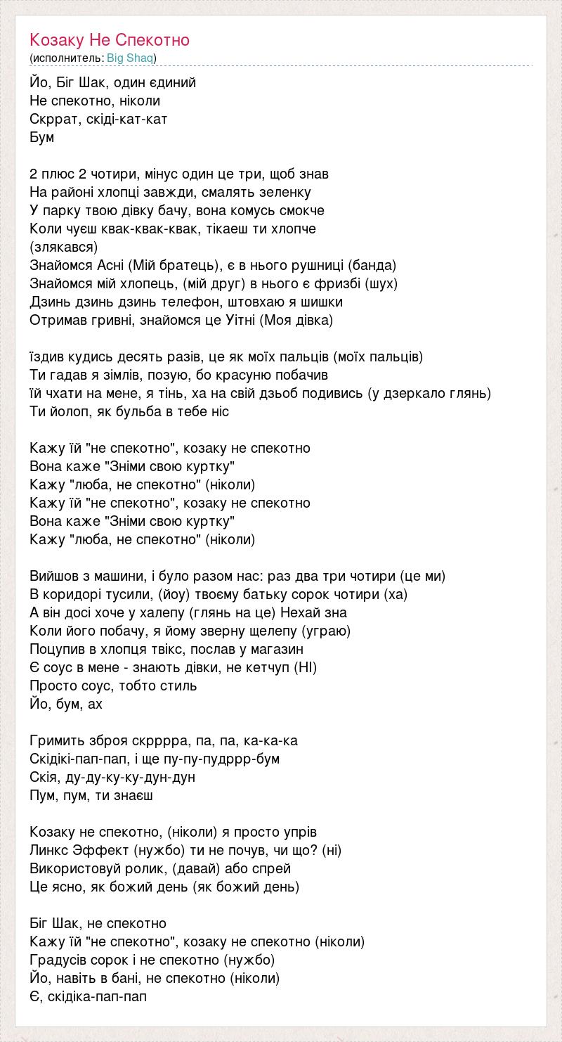 Йо, Біг Шак, один єдиний Не спекотно, ніколи Скррат, скіді-кат-кат Бум 2 плюс 2 чотири, мінус один це три, щоб знав На районі хлопці завжди, смалять зеленку У парку твою дівку бачу, вона комусь смокче Коли чуєш квак-квак-квак, тікаеш ти хлопче (злякався) Знайомся Асні (Мій братець), є в нього рушниці (банда) Знайомся мій хлопець, (мій друг) в нього є фризбі (шух) Дзинь дзинь дзинь телефон, штовхаю я шишки Отримав гривні, знайомся це Уітні (Моя дівка) їздив кудись десять разів, це як моїх пальців (моїх пальців) Ти гадав я зімлів, позую, бо красуню побачив їй чхати на мене, я тінь, ха на свій дзьоб подивись (у дзеркало глянь) Ти йолоп, як бульба в тебе ніс Кажу їй "не спекотно", козаку не спекотно Вона каже "Зніми свою куртку" Кажу "люба, не спекотно" (ніколи) Кажу їй "не спекотно", козаку не спекотно Вона каже "Зніми свою куртку" Кажу "люба, не спекотно" (ніколи) Вийшов з машини, і було разом нас: раз два три чотири (це ми) В коридорі тусили, (йоу) твоєму батьку сорок чотири (ха) А він досі хоче у халепу (глянь на це) Нехай зна Коли його побачу, я йому зверну щелепу (уграю) Поцупив в хлопця твікс, послав у магазин Є соус в мене - знають дівки, не кетчуп (НІ) Просто соус, тобто стиль Йо, бум, ах Гримить зброя скрррра, па, па, ка-ка-ка Скідікі-пап-пап, і ще пу-пу-пудррр-бум Скія, ду-ду-ку-ку-дун-дун Пум, пум, ти знаєш Козаку не спекотно, (ніколи) я просто упрів Линкс Эффект (нужбо) ти не почув, чи що? (ні) Використовуй ролик, (давай) або спрей Це ясно, як божий день (як божий день) Біг Шак, не спекотно Кажу їй "не спекотно", козаку не спекотно (ніколи) Градусів сорок і не спекотно (нужбо) Йо, навіть в бані, не спекотно (ніколи) Є, скідіка-пaп-пaп