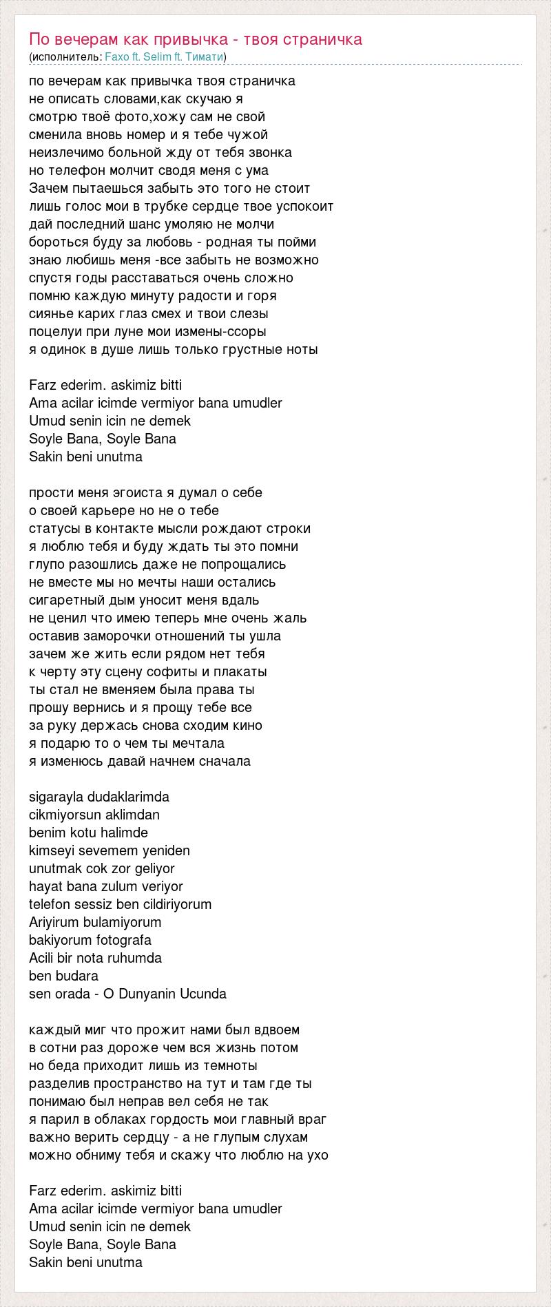 по вечерам как привычка твоя страничка не описать словами,как скучаю я смотрю твоё фото,хожу сам не свой сменила вновь номер и я тебе чужой неизлечимо больной жду от тебя звонка но телефон молчит сводя меня с ума Зачем пытаешься забыть это того не стоит лишь голос мои в трубке сердце твое успокоит дай последний шанс умоляю не молчи бороться буду за любовь - родная ты пойми знаю любишь меня -все забыть не возможно спустя годы расставаться очень сложно помню каждую минуту радости и горя сиянье карих глаз смех и твои слезы поцелуи при луне мои измены-ссоры я одинок в душе лишь только грустные ноты Farz ederim. askimiz bitti Ama acilar icimde vermiyor bana umudler Umud senin icin ne demek Soyle Bana, Soyle Bana Sakin beni unutma прости меня эгоиста я думал о себе о своей карьере но не о тебе статусы в контакте мысли рождают строки я люблю тебя и буду ждать ты это помни глупо разошлись даже не попрощались не вместе мы но мечты наши остались сигаретный дым уносит меня вдаль не ценил что имею теперь мне очень жаль оставив заморочки отношений ты ушла зачем же жить если рядом нет тебя к черту эту сцену софиты и плакаты ты стал не вменяем была права ты прошу вернись и я прощу тебе все за руку держась снова сходим кино я подарю то о чем ты мечтала я изменюсь давай начнем сначала sigarayla dudaklarimda cikmiyorsun aklimdan benim kotu halimde kimseyi sevemem yeniden unutmak cok zor geliyor hayat bana zulum veriyor telefon sessiz ben cildiriyorum Ariyirum bulamiyorum bakiyorum fotografa Acili bir nota ruhumda ben budara sen orada - O Dunyanin Ucunda каждый миг что прожит нами был вдвоем в сотни раз дороже чем вся жизнь потом но беда приходит лишь из темноты разделив пространство на тут и там где ты понимаю был неправ вел себя не так я парил в облаках гордость мои главный враг важно верить сердцу - а не глупым слухам можно обниму тебя и скажу что люблю на ухо Farz ederim. askimiz bitti Ama acilar icimde vermiyor bana umudler Umud senin icin ne demek Soyle Bana, Soyle Bana Sakin beni unutma