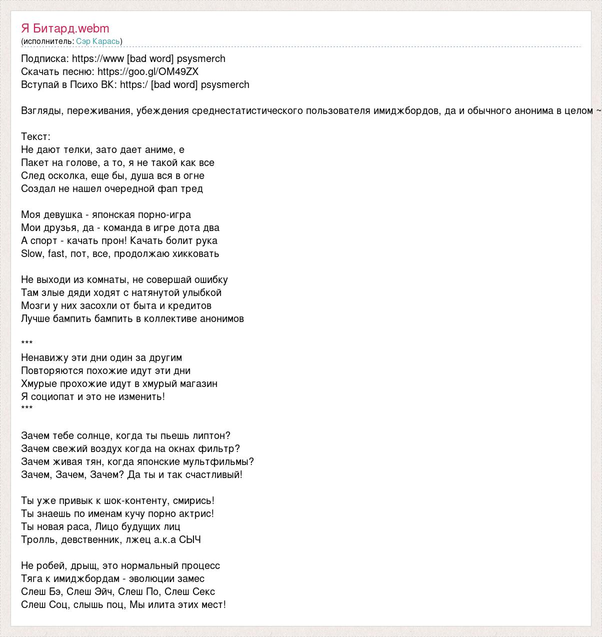 Подписка: https://www [bad word] psysmerch Скачать песню: https://goo.gl/OM49ZX Вступай в Психо ВК: https:/ [bad word] psysmerch Взгляды, переживания, убеждения среднестатистического пользователя имиджбордов, да и обычного анонима в целом ~ Текст: Не дают телки, зато дает аниме, е Пакет на голове, а то, я не такой как все След осколка, еще бы, душа вся в огне Создал не нашел очередной фап тред Моя девушка - японская порно-игра Мои друзья, да - команда в игре дота два А спорт - качать прон! Качать болит рука Slow, fast, пот, все, продолжаю хикковать Не выходи из комнаты, не совершай ошибку Там злые дяди ходят с натянутой улыбкой Мозги у них засохли от быта и кредитов Лучше бампить бампить в коллективе анонимов *** Ненавижу эти дни один за другим Повторяются похожие идут эти дни Хмурые прохожие идут в хмурый магазин Я социопат и это не изменить! *** Зачем тебе солнце, когда ты пьешь липтон? Зачем свежий воздух когда на окнах фильтр? Зачем живая тян, когда японские мультфильмы? Зачем, Зачем, Зачем? Да ты и так счастливый! Ты уже привык к шок-контенту, смирись! Ты знаешь по именам кучу порно актрис! Ты новая раса, Лицо будущих лиц Тролль, девственник, лжец а.к.а СЫЧ Не робей, дрыщ, это нормальный процесс Тяга к имиджбордам - эволюции замес Слеш Бэ, Слеш Эйч, Слеш По, Слеш Секс Слеш Соц, слышь поц, Мы илита этих мест!