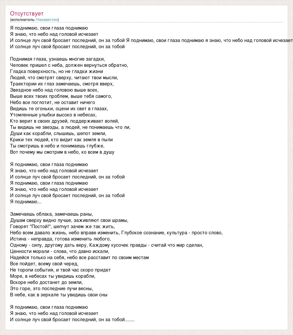 Я поднимаю, свои глаза поднимаю Я знаю, что небо над головой исчезает И солнце луч свой бросает последний, он за тобой Я поднимаю, свои глаза поднимаю я знаю, что небо над головой исчезает И солнце луч свой бросает последний, он за тобой Поднимая глаза, узнаешь многие загадки, Человек пришел с неба, должен вернуться обратно, Гладка поверхность, но не гладки жизни Людей, что смотрят сверху, читают твои мысли, Траектории их глаз замечаешь, смотря вверх, Звездное небо над головою выше всех, Выше всех твоих проблем, выше тебя самого, Небо все поглотит, не оставит ничего Видишь те огоньки, оцени их свет в глазах, Утомленные улыбки высоко в небесах, Кто верит в своих друзей, поддерживает волей, Ты видишь не звезды, а людей, не понимаешь что ли, Души как корабли, слышишь, шепот земли, Крики тех людей, кто видит как земля в пыли Ты смотришь в небо и понимаешь глубже, Вот почему мы смотрим в небо, ко всем в душу Я поднимаю, свои глаза поднимаю Я знаю, что небо над головой исчезает И солнце луч свой бросает последний, он за тобой Я поднимаю, свои глаза поднимаю Я знаю, что небо над головой исчезает И солнце луч свой бросает последний, он за тобой Я поднимаю... Замечаешь облака, замечаешь раны, Душам сверху видно лучше, заживляют свои шрамы, Говорят "Постой!", шепчут зачем же так жить, Небо всем давало жизнь, небо вправе изменить, Глубокое сознание, культура - просто слово, Истина - неправда, готова изменить любого, Одному - силу, другому дать веру, Каждому кусочек правды - считай что мир сделан, Ценности морали - слова, что давно искали, Надейся только на себя, небо все расставит по своим местам Все пойдет, всему свой черед, Не торопи события, и твой час скоро придет Море, в небесах ты увидишь корабли, Вскоре небо достанет до земли, Это горе, это последние лучи весны, В небе, как в зеркале ты увидишь свои сны Я поднимаю, свои глаза поднимаю Я знаю, что небо над головой исчезает И солнце луч свой бросает последний, он за тобой.......