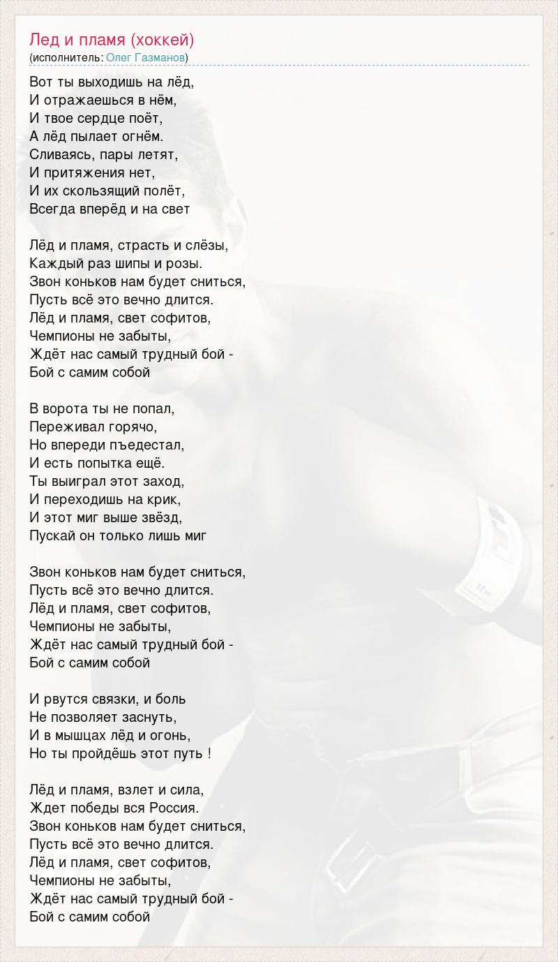 Вот ты выходишь на лёд, И отражаешься в нём, И твое сердце поёт, А лёд пылает огнём. Сливаясь, пары летят, И притяжения нет, И их скользящий полёт, Всегда вперёд и на свет Лёд и пламя, страсть и слёзы, Каждый раз шипы и розы. Звон коньков нам будет сниться, Пусть всё это вечно длится. Лёд и пламя, свет софитов, Чемпионы не забыты, Ждёт нас самый трудный бой - Бой с самим собой В ворота ты не попал, Переживал горячо, Но впереди пъедестал, И есть попытка ещё. Ты выиграл этот заход, И переходишь на крик, И этот миг выше звёзд, Пускай он только лишь миг Звон коньков нам будет сниться, Пусть всё это вечно длится. Лёд и пламя, свет софитов, Чемпионы не забыты, Ждёт нас самый трудный бой - Бой с самим собой И рвутся связки, и боль Не позволяет заснуть, И в мышцах лёд и огонь, Но ты пройдёшь этот путь ! Лёд и пламя, взлет и сила, Ждет победы вся Россия. Звон коньков нам будет сниться, Пусть всё это вечно длится. Лёд и пламя, свет софитов, Чемпионы не забыты, Ждёт нас самый трудный бой - Бой с самим собой