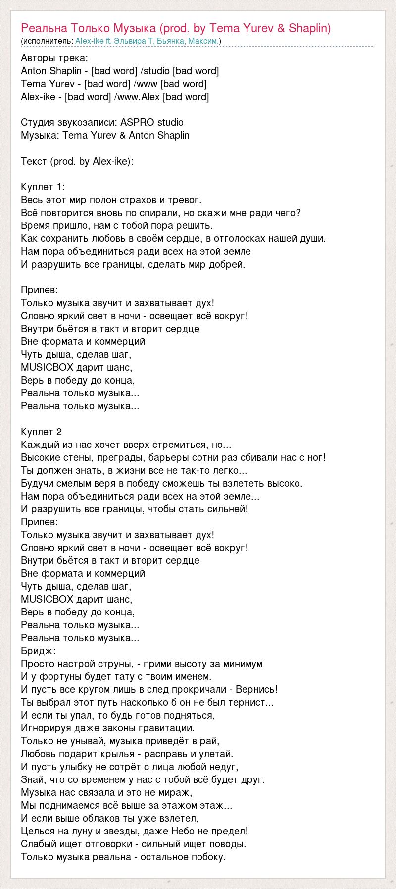 Авторы трека: Anton Shaplin - [bad word] /studio [bad word] Tema Yurev - [bad word] /www [bad word] Alex-ike - [bad word] /www.Alex [bad word] Студия звукозаписи: ASPRO studio Музыка: Tema Yurev & Anton Shaplin Текст (prod. by Alex-ike): Куплет 1: Весь этот мир полон страхов и тревог. Всё повторится вновь по спирали, но скажи мне ради чего? Время пришло, нам с тобой пора решить. Как сохранить любовь в своём сердце, в отголосках нашей души. Нам пора объединиться ради всех на этой земле И разрушить все границы, сделать мир добрей. Припев: Только музыка звучит и захватывает дух! Словно яркий свет в ночи - освещает всё вокруг! Внутри бьётся в такт и вторит сердце Вне формата и коммерций Чуть дыша, сделав шаг, MUSICBOX дарит шанс, Верь в победу до конца, Реальна только музыка... Реальна только музыка... Куплет 2 Каждый из нас хочет вверх стремиться, но... Высокие стены, преграды, барьеры сотни раз сбивали нас с ног! Ты должен знать, в жизни все не так-то легко... Будучи смелым веря в победу сможешь ты взлететь высоко. Нам пора объединиться ради всех на этой земле... И разрушить все границы, чтобы стать сильней! Припев: Только музыка звучит и захватывает дух! Словно яркий свет в ночи - освещает всё вокруг! Внутри бьётся в такт и вторит сердце Вне формата и коммерций Чуть дыша, сделав шаг, MUSICBOX дарит шанс, Верь в победу до конца, Реальна только музыка... Реальна только музыка... Бридж: Просто настрой струны, - прими высоту за минимум И у фортуны будет тату с твоим именем. И пусть все кругом лишь в след прокричали - Вернись! Ты выбрал этот путь насколько б он не был тернист... И если ты упал, то будь готов подняться, Игнорируя даже законы гравитации. Только не унывай, музыка приведёт в рай, Любовь подарит крылья - расправь и улетай. И пусть улыбку не сотрёт с лица любой недуг, Знай, что со временем у нас с тобой всё будет друг. Музыка нас связала и это не мираж, Мы поднимаемся всё выше за этажом этаж... И если выше облаков ты уже взлетел, Целься на луну и звезды, даже Небо не предел! Слабый ищет отговорки - сильный ищет поводы. Только музыка реальна - остальное побоку.