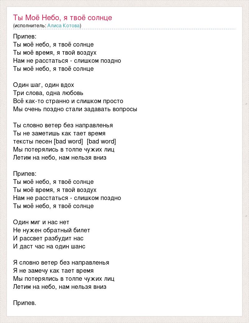 Припев: Ты моё небо, я твоё солнце Ты моё время, я твой воздух Нам не расстаться - слишком поздно Ты моё небо, я твоё солнце Один шаг, один вдох Три слова, одна любовь Всё как-то странно и слишком просто Мы очень поздно стали задавать вопросы Ты словно ветер без направленья Ты не заметишь как тает время тексты песен [bad word] [bad word] Мы потерялись в толпе чужих лиц Летим на небо, нам нельзя вниз Припев: Ты моё небо, я твоё солнце Ты моё время, я твой воздух Нам не расстаться - слишком поздно Ты моё небо, я твоё солнце Один миг и нас нет Не нужен обратный билет И рассвет разбудит нас И даст час на один шанс Я словно ветер без направленья Я не замечу как тает время Мы потерялись в толпе чужих лиц Летим на небо, нам нельзя вниз Припев.
