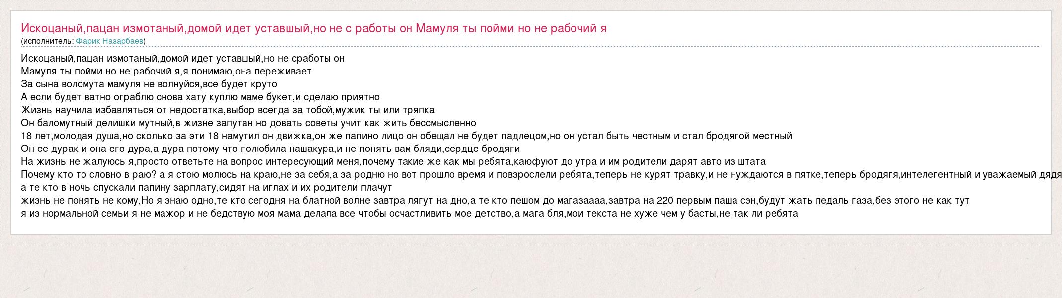 Искоцаный,пацан измотаный,домой идет уставшый,но не сработы он Мамуля ты пойми но не рабочий я,я понимаю,она переживает За сына воломута мамуля не волнуйся,все будет круто А если будет ватно ограблю снова хату куплю маме букет,и сделаю приятно Жизнь научила избавляться от недостатка,выбор всегда за тобой,мужик ты или тряпка Он баломутный делишки мутный,в жизне запутан но довать советы учит как жить бессмысленно 18 лет,молодая душа,но сколько за эти 18 намутил он движка,он же папино лицо он обещал не будет падлецом,но он устал быть честным и стал бродягой местный Он ее дурак и она его дура,а дура потому что полюбила нашакура,и не понять вам бляди,сердце бродяги На жизнь не жалуюсь я,просто ответьте на вопрос интересующий меня,почему такие же как мы ребята,каюфуют до утра и им родители дарят авто из штата Почему кто то словно в раю? а я стою молюсь на краю,не за себя,а за родню но вот прошло время и повзрослели ребята,теперь не курят травку,и не нуждаются в пятке,теперь бродягя,интелегентный и уважаемый дядя а те кто в ночь спускали папину зарплату,сидят на иглах и их родители плачут жизнь не понять не кому,Но я знаю одно,те кто сегодня на блатной волне завтра лягут на дно,а те кто пешом до магазаааа,завтра на 220 первым паша сэн,будут жать педаль газа,без этого не как тут я из нормальной семьи я не мажор и не бедствую моя мама делала все чтобы осчастливить мое детство,а мага бля,мои текста не хуже чем у басты,не так ли ребята