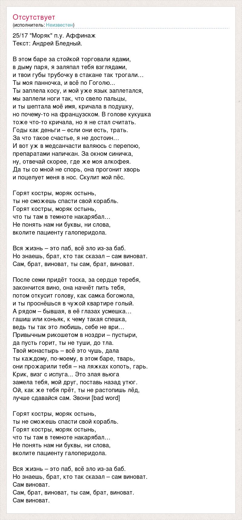 25/17 "Моряк" п.у. Аффинаж Текст: Андрей Бледный. В этом баре за стойкой торговали ядами, в дыму паря, я заляпал тебя взглядами, и твои губы трубочку в стакане так трогали… Ты моя панночка, и всё по Гоголю... Ты заплела косу, и мой уже язык заплетался, мы заплели ноги так, что свело пальцы, и ты шептала моё имя, кричала в подушку, но почему-то на французском. В голове кукушка тоже что-то кричала, но я не стал считать. Годы как деньги – если они есть, трать. За что такое счастье, я не достоин… И вот уж в медсанчасти валяюсь с перепою, препаратами напичкан. За окном синичка, ну, отвечай скорее, где же моя алкофея. Да ты со мной не спорь, она прогонит хворь и поцелует меня в нос. Скулит мой пёс. Горят костры, моряк остынь, ты не сможешь спасти свой корабль. Горят костры, моряк остынь, что ты там в темноте накарябал… Не понять нам ни буквы, ни слова, вколите пациенту галоперидола. Вся жизнь – это паб, всё зло из-за баб. Но знаешь, брат, кто так сказал – сам виноват. Сам, брат, виноват, ты сам, брат, виноват. После семи придёт тоска, за сердце теребя, закончится вино, она начнёт пить тебя, потом откусит голову, как самка богомола, и ты проснёшься в чужой квартире голый. А рядом – бывшая, в её глазах усмешка… гашиш или коньяк, к чему такая спешка, ведь ты так это любишь, себе не ври… Привычным рикошетом в ноздри – пустыри, да пусть горит, ты не туши, до тла. Твой монастырь – всё это чушь, дала ты каждому, по-моему, в этом баре, тварь, они прожарили тебя – на ляжках копоть, гарь. Крик, визг с испуга... Это злая вьюга замела тебя, мой друг, поставь назад утюг. Ой, как же тебя прёт, ты не растопишь лёд, лучше сдавайся сам. Звони [bad word] Горят костры, моряк остынь, ты не сможешь спасти свой корабль. Горят костры, моряк остынь, что ты там в темноте накарябал… Не понять нам ни буквы, ни слова, вколите пациенту галоперидола. Вся жизнь – это паб, всё зло из-за баб. Но знаешь, брат, кто так сказал – сам виноват. Сам виноват. Сам, брат, виноват, ты сам, брат, виноват. Сам виноват.