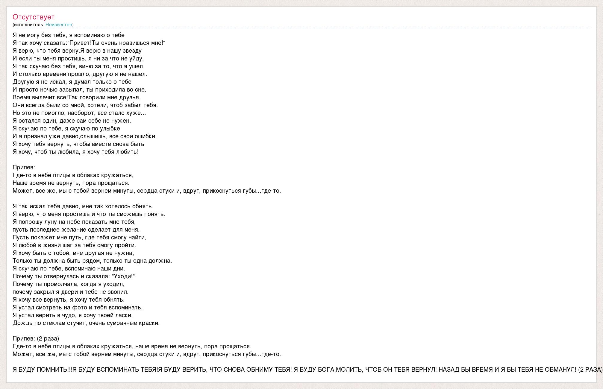 Я не могу без тебя, я вспоминаю о тебе Я так хочу сказать:"Привет!Ты очень нравишься мне!" Я верю, что тебя верну.Я верю в нашу звезду И если ты меня простишь, я ни за что не уйду. Я так скучаю без тебя, виню за то, что я ушел И столько времени прошло, другую я не нашел. Другую я не искал, я думал только о тебе И просто ночью засыпал, ты приходила во сне. Время вылечит все!Так говорили мне друзья. Они всегда были со мной, хотели, чтоб забыл тебя. Но это не помогло, наоборот, все стало хуже... Я остался один, даже сам себе не нужен. Я скучаю по тебе, я скучаю по улыбке И я признал уже давно,слышишь, все свои ошибки. Я хочу тебя вернуть, чтобы вместе снова быть Я хочу, чтоб ты любила, я хочу тебя любить! Припев: Где-то в небе птицы в облаках кружаться, Наше время не вернуть, пора прощаться. Может, все же, мы с тобой вернем минуты, сердца стуки и, вдруг, прикоснуться губы...где-то. Я так искал тебя давно, мне так хотелось обнять. Я верю, что меня простишь и что ты сможешь понять. Я попрошу луну на небе показать мне тебя, пусть последнее желание сделает для меня. Пусть покажет мне путь, где тебя смогу найти, Я любой в жизни шаг за тебя смогу пройти. Я хочу быть с тобой, мне другая не нужна, Только ты должна быть рядом, только ты одна должна. Я скучаю по тебе, вспоминаю наши дни. Почему ты отвернулась и сказала: "Уходи!" Почему ты промолчала, когда я уходил, почему закрыл я двери и тебе не звонил. Я хочу все вернуть, я хочу тебя обнять. Я устал смотреть на фото и тебя вспоминать. Я устал верить в чудо, я хочу твоей ласки. Дождь по стеклам стучит, очень сумрачные краски. Припев: (2 раза) Где-то в небе птицы в облаках кружаться, наше время не вернуть, пора прощаться. Может, все же, мы с тобой вернем минуты, сердца стуки и, вдруг, прикоснуться губы...где-то. Я БУДУ ПОМНИТЬ!!!Я БУДУ ВСПОМИНАТЬ ТЕБЯ!Я БУДУ ВЕРИТЬ, ЧТО СНОВА ОБНИМУ ТЕБЯ! Я БУДУ БОГА МОЛИТЬ, ЧТОБ ОН ТЕБЯ ВЕРНУЛ! НАЗАД БЫ ВРЕМЯ И Я БЫ ТЕБЯ НЕ ОБМАНУЛ! (2 РАЗА)