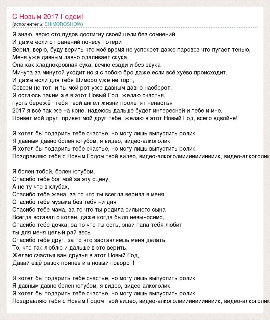 Я знаю, верю сто пудов достигну своей цели без сомнений И даже если от ранений понесу потери Верил, верю, буду верить что моё время не успокоет даже паровоз что пугает тенью, Меня уже давным давно одаливает скука, Она как хладнокровная сука, вечно сзади и без звука Минута за минутой уходит но я с тобою бро даже если всё хуёво происходит. И даже если для тебя Шиморо уже не торт, Совсем не тот, и ты мой рот уже давным давно наоборот. Я остаюсь таким же в этот Новый Год, желаю счастья, пусть бережёт тебя твой ангел жизни пролетят ненастья 2017 я всё так же на коне, надеюсь дальше будет интересней и тебе и мне, Привет мой друг, привет мой друг тебе, желаю в этот Новый Год, всего вдвойне! Я хотел бы подарить тебе счастье, но могу лишь выпустить ролик Я давным давно болен ютубом, я видео, видео-алкоголик Я хотел бы подарить тебе счастье, но могу лишь выпустить ролик Поздравляю тебя с Новым Годом твой видео, видео-алкоголиииииииииииик, видео-алкоголик Я болен тобой, болен ютубом, Спасибо тебе бог мой за эту сцену, А не ту что в клубах, Спасибо тебе жена, за то что ты всегда верила в меня, Спасибо тебе музыка без тебя ни дня Спасибо тебе мама, за то что ты родила сильного сына Всегда вставал с колен, даже когда было невыносимо, Спасибо тебе дочка, за то что ты есть, знай папа тебя любит ты для меня целый рай весь Спасибо тебе друг, за то что заставляешь меня делать То, что так люблю и дальше в это верить, Желаю счастья вам друзья в этот Новый Год, Давай ещё разок припев и в новый поворот! Я хотел бы подарить тебе счастье, но могу лишь выпустить ролик Я давным давно болен ютубом, я видео, видео-алкоголик Я хотел бы подарить тебе счастье, но могу лишь выпустить ролик Поздравляю тебя с Новым Годом твой видео, видео-алкоголиииииииииииик, видео-алкоголик