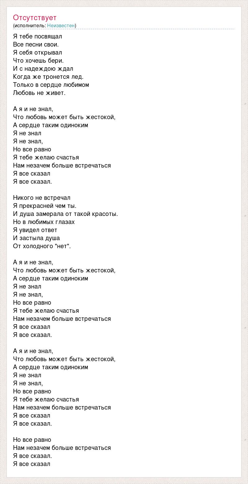 Я тебе посвящал Все песни свои. Я себя открывал Что хочешь бери. И с надеждою ждал Когда же тронется лед. Только в сердце любимом Любовь не живет. А я и не знал, Что любовь может быть жестокой, А сердце таким одиноким Я не знал Я не знал, Но все равно Я тебе желаю счастья Нам незачем больше встречаться Я все сказал Я все сказал. Никого не встречал Я прекрасней чем ты. И душа замерала от такой красоты. Но в любимых глазах Я увидел ответ И застыла душа От холодного "нет". А я и не знал, Что любовь может быть жестокой, А сердце таким одиноким Я не знал Я не знал, Но все равно Я тебе желаю счастья Нам незачем больше встречаться Я все сказал Я все сказал. А я и не знал, Что любовь может быть жестокой, А сердце таким одиноким Я не знал Я не знал, Но все равно Я тебе желаю счастья Нам незачем больше встречаться Я все сказал Я все сказал. Но все равно Нам незачем больше встречаться Я все сказал. Я все сказал