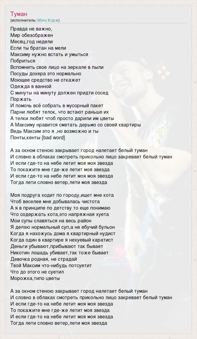 Правда не важно, Мир обезображен Месяц,год недели Если ты братан на мели Максиму нужно встать и умыться Побриться Вспомнить свое лицо на зеркале в пыли Посуды дохера это нормально Моющее средство не откажет Одежда в ванной С минуты на минуту должен придти сосед Поржать И помочь всё собрать в мусорный пакет Парни любят телок, что встают раньше их А телки любят чтоб просто дарили им цветы А Максиму нравится сметать дерьмо со своей квартиры Ведь Максим это я ,но возможно и ты Понты,кенты [bad word] А за окном стеною закрывает город налетает белый туман И словно в облаках смотреть прикольно лицо закревает белый туман И если где-то на небе летит моя моя звезда То покажите мне где-же летит моя звезда И если где-то на небе летит моя моя звезда Тогда лети словно ветер,лети моя звезда Моя подруга ходит по городу,ищет мне кота Чтоб веселее мне добывалась чистота А я в принципе по детству то еще понимаю Что содержать кота,это напряжная хуета Мои супы славяться на весь район Я делаю нормальный суп,а не ебучий бульон Когда я нахожусь дома я квартирный нудист Когда один в квартире я нехуевый каратист Деньги убывают,прибывают так бывает Никотин лошадь убивает,так тоже бывает Девочка родная, не страдай Твой Максим что-нибудь потсуетит Что до этого не суетил Морожка,типо цветы А за окном стеною закрывает город налетает белый туман И словно в облаках смотреть прикольно лицо закревает белый туман И если где-то на небе летит моя моя звезда То покажите мне где-же летит моя звезда И если где-то на небе летит моя моя звезда Тогда лети словно ветер,лети моя звезда