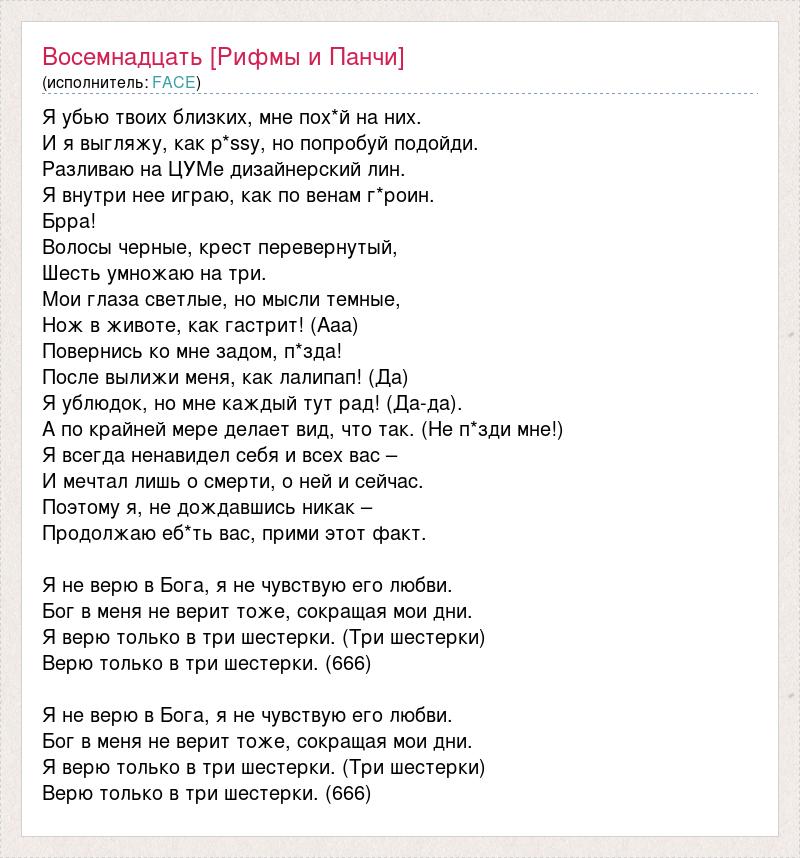 Я убью твоих близких, мне пох*й на них. И я выгляжу, как p*ssy, но попробуй подойди. Разливаю на ЦУМе дизайнерский лин. Я внутри нее играю, как по венам г*роин. Брра! Волосы черные, крест перевернутый, Шесть умножаю на три. Мои глаза светлые, но мысли темные, Нож в животе, как гастрит! (Ааа) Повернись ко мне задом, п*зда! После вылижи меня, как лалипап! (Да) Я ублюдок, но мне каждый тут рад! (Да-да). А по крайней мере делает вид, что так. (Не п*зди мне!) Я всегда ненавидел себя и всех вас – И мечтал лишь о смерти, о ней и сейчас. Поэтому я, не дождавшись никак – Продолжаю еб*ть вас, прими этот факт. Я не верю в Бога, я не чувствую его любви. Бог в меня не верит тоже, сокращая мои дни. Я верю только в три шестерки. (Три шестерки) Верю только в три шестерки. (666) Я не верю в Бога, я не чувствую его любви. Бог в меня не верит тоже, сокращая мои дни. Я верю только в три шестерки. (Три шестерки) Верю только в три шестерки. (666)