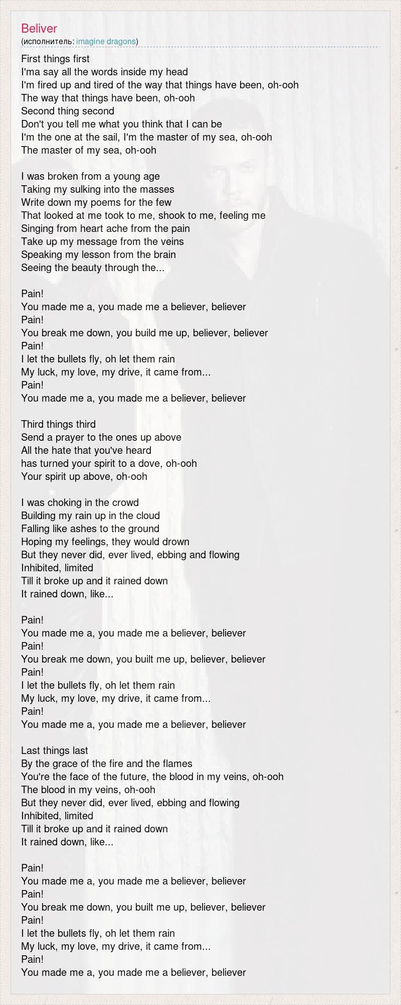 First things first I'ma say all the words inside my head I'm fired up and tired of the way that things have been, oh-ooh The way that things have been, oh-ooh Second thing second Don't you tell me what you think that I can be I'm the one at the sail, I'm the master of my sea, oh-ooh The master of my sea, oh-ooh I was broken from a young age Taking my sulking into the masses Write down my poems for the few That looked at me took to me, shook to me, feeling me Singing from heart ache from the pain Take up my message from the veins Speaking my lesson from the brain Seeing the beauty through the... Pain! You made me a, you made me a believer, believer Pain! You break me down, you build me up, believer, believer Pain! I let the bullets fly, oh let them rain My luck, my love, my drive, it came from... Pain! You made me a, you made me a believer, believer Third things third Send a prayer to the ones up above All the hate that you've heard has turned your spirit to a dove, oh-ooh Your spirit up above, oh-ooh I was choking in the crowd Building my rain up in the cloud Falling like ashes to the ground Hoping my feelings, they would drown But they never did, ever lived, ebbing and flowing Inhibited, limited Till it broke up and it rained down It rained down, like... Pain! You made me a, you made me a believer, believer Pain! You break me down, you built me up, believer, believer Pain! I let the bullets fly, oh let them rain My luck, my love, my drive, it came from... Pain! You made me a, you made me a believer, believer Last things last By the grace of the fire and the flames You're the face of the future, the blood in my veins, oh-ooh The blood in my veins, oh-ooh But they never did, ever lived, ebbing and flowing Inhibited, limited Till it broke up and it rained down It rained down, like... Pain! You made me a, you made me a believer, believer Pain! You break me down, you built me up, believer, believer Pain! I let the bullets fly, oh let them rain My luck, my love, my drive, it came from... Pain! You made me a, you made me a believer, believer