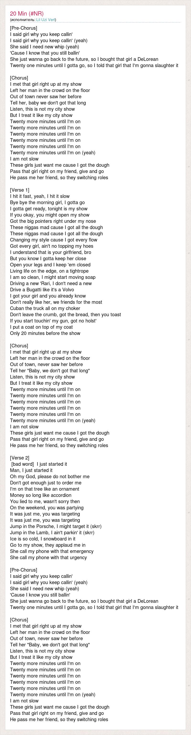 [Pre-Chorus] I said girl why you keep callin' I said girl why you keep callin' (yeah) She said I need new whip (yeah) 'Cause I know that you still ballin' She just wanna go back to the future, so I bought that girl a DeLorean Twenty one minutes until I gotta go, so I told that girl that I'm gonna slaughter it [Chorus] I met that girl right up at my show Left her man in the crowd on the floor Out of town never saw her before Tell her, baby we don't got that long Listen, this is not my city show But I treat it like my city show Twenty more minutes until I'm on Twenty more minutes until I'm on Twenty more minutes until I'm on Twenty more minutes until I'm on Twenty more minutes until I'm on Twenty more minutes until I'm on (yeah) I am not slow These girls just want me cause I got the dough Pass that girl right on my friend, give and go He pass me her friend, so they switching roles [Verse 1] I hit it fast, yeah, I hit it slow Bye bye the morning girl, I gotta go I gotta get ready, tonight is my show If you okay, you might open my show Got the big pointers right under my nose These niggas mad cause I got all the dough These niggas mad cause I got all the dough Changing my style cause I got every flow Got every girl, ain't no topping my hoes I understand that is your girlfriend, bro But you know I gotta keep her close Open your legs and I keep 'em closed Living life on the edge, on a tightrope I am so clean, I might start moving soap Driving a new 'Rari, I don't need a new Drive a Bugatti like it's a Volvo I got your girl and you already know Don't really like her, we friends for the most Cuban the truck all on my choker Don't leave the crumb, got the bread, then you toast If you start touchin' my gun, got no holst' I put a coat on top of my coat Only 20 minutes before the show [Chorus] I met that girl right up at my show Left her man in the crowd on the floor Out of town, never saw her before Tell her "Baby, we don't got that long" Listen, this is not my city show But I treat it like my city show Twenty more minutes until I'm on Twenty more minutes until I'm on Twenty more minutes until I'm on Twenty more minutes until I'm on Twenty more minutes until I'm on Twenty more minutes until I'm on (yeah) I am not slow These girls just want me cause I got the dough Pass that girl right on my friend, give and go He pass me her friend, so they switching roles [Verse 2] [bad word] I just started it Man, I just started it Oh my God, please do not bother me Don't got enough just to order me I'm on that tree like an ornament Money so long like accordion You lied to me, wasn't sorry then On the weekend, you was partying It was just me, you was targeting It was just me, you was targeting Jump in the Porsche, I might target it (skrr) Jump in the Lamb, I ain't parkin' it (skrr) Ice is so cold, I snowboard in it Go to my show, they applaud me in She call my phone with that emergency She call my phone with that urgency [Pre-Chorus] I said girl why you keep callin' I said girl why you keep callin' (yeah) She said I need new whip (yeah) 'Cause I know you still ballin' She just wanna go back to the future, so I bought that girl a DeLorean Twenty one minutes until I gotta go, so I told that girl that I'm gonna slaughter it [Chorus] I met that girl right up at my show Left her man in the crowd on the floor Out of town, never saw her before Tell her "Baby, we don't got that long" Listen, this is not my city show But I treat it like my city show Twenty more minutes until I'm on Twenty more minutes until I'm on Twenty more minutes until I'm on Twenty more minutes until I'm on Twenty more minutes until I'm on Twenty more minutes until I'm on (yeah) I am not slow These girls just want me cause I got the dough Pass that girl right on my friend, give and go He pass me her friend, so they switching roles