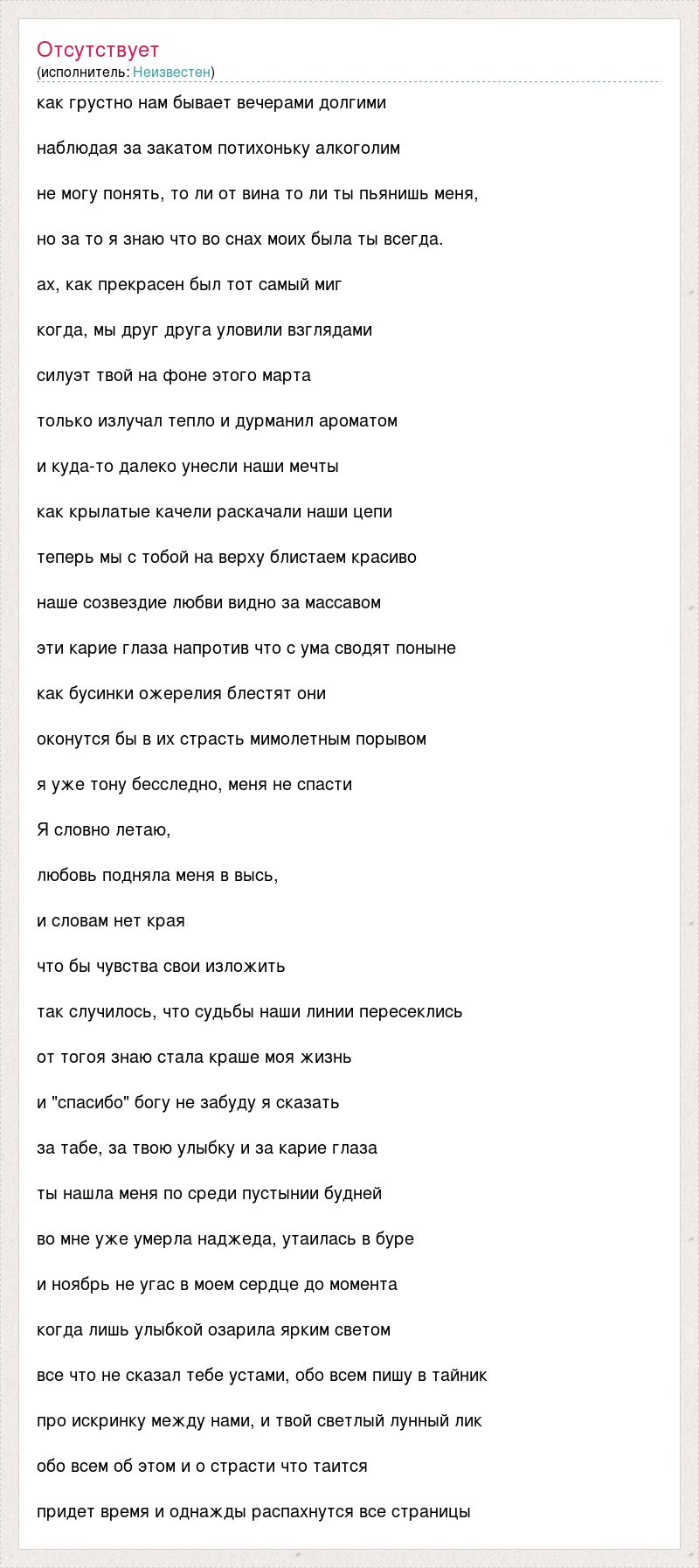 как грустно нам бывает вечерами долгими наблюдая за закатом потихоньку алкоголим не могу понять, то ли от вина то ли ты пьянишь меня, но за то я знаю что во снах моих была ты всегда. ах, как прекрасен был тот самый миг когда, мы друг друга уловили взглядами силуэт твой на фоне этого марта только излучал тепло и дурманил ароматом и куда-то далеко унесли наши мечты как крылатые качели раскачали наши цепи теперь мы с тобой на верху блистаем красиво наше созвездие любви видно за массавом эти карие глаза напротив что с ума сводят поныне как бусинки ожерелия блестят они оконутся бы в их страсть мимолетным порывом я уже тону бесследно, меня не спасти Я словно летаю, любовь подняла меня в высь, и словам нет края что бы чувства свои изложить так случилось, что судьбы наши линии пересеклись от тогоя знаю стала краше моя жизнь и "спасибо" богу не забуду я сказать за табе, за твою улыбку и за карие глаза ты нашла меня по среди пустынии будней во мне уже умерла наджеда, утаилась в буре и ноябрь не угас в моем сердце до момента когда лишь улыбкой озарила ярким светом все что не сказал тебе устами, обо всем пишу в тайник про искринку между нами, и твой светлый лунный лик обо всем об этом и о страсти что таится придет время и однажды распахнутся все страницы