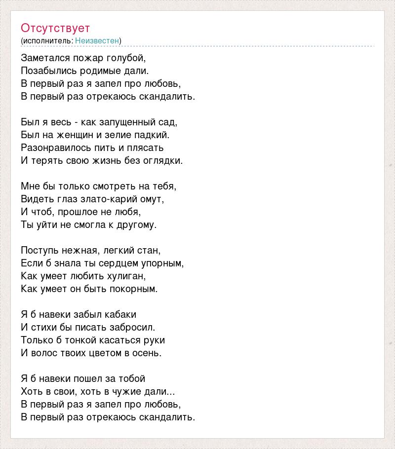 Заметался пожар голубой, Позабылись родимые дали. В первый раз я запел про любовь, В первый раз отрекаюсь скандалить. Был я весь - как запущенный сад, Был на женщин и зелие падкий. Разонравилось пить и плясать И терять свою жизнь без оглядки. Мне бы только смотреть на тебя, Видеть глаз злато-карий омут, И чтоб, прошлое не любя, Ты уйти не смогла к другому. Поступь нежная, легкий стан, Если б знала ты сердцем упорным, Как умеет любить хулиган, Как умеет он быть покорным. Я б навеки забыл кабаки И стихи бы писать забросил. Только б тонкой касаться руки И волос твоих цветом в осень. Я б навеки пошел за тобой Хоть в свои, хоть в чужие дали... В первый раз я запел про любовь, В первый раз отрекаюсь скандалить.