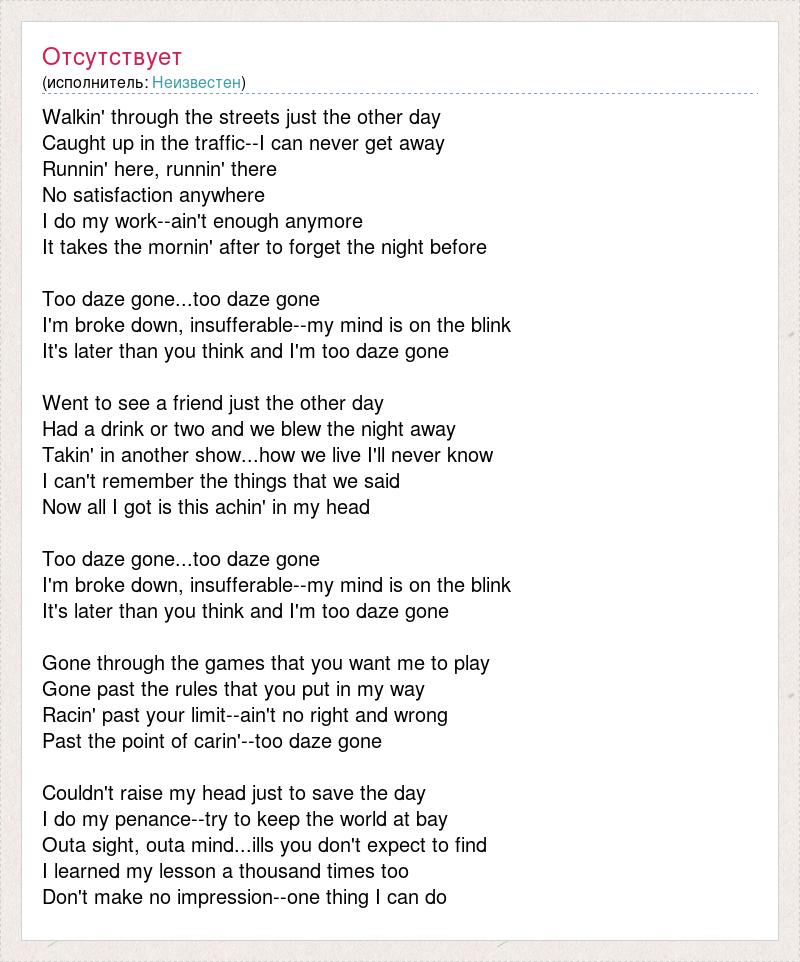 Walkin' through the streets just the other day Caught up in the traffic--I can never get away Runnin' here, runnin' there No satisfaction anywhere I do my work--ain't enough anymore It takes the mornin' after to forget the night before Too daze gone...too daze gone I'm broke down, insufferable--my mind is on the blink It's later than you think and I'm too daze gone Went to see a friend just the other day Had a drink or two and we blew the night away Takin' in another show...how we live I'll never know I can't remember the things that we said Now all I got is this achin' in my head Too daze gone...too daze gone I'm broke down, insufferable--my mind is on the blink It's later than you think and I'm too daze gone Gone through the games that you want me to play Gone past the rules that you put in my way Racin' past your limit--ain't no right and wrong Past the point of carin'--too daze gone Couldn't raise my head just to save the day I do my penance--try to keep the world at bay Outa sight, outa mind...ills you don't expect to find I learned my lesson a thousand times too Don't make no impression--one thing I can do