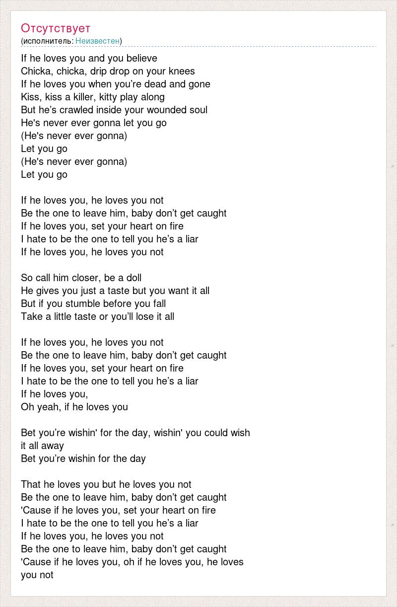 If he loves you and you believe Chicka, chicka, drip drop on your knees If he loves you when you’re dead and gone Kiss, kiss a killer, kitty play along But he’s crawled inside your wounded soul He's never ever gonna let you go (He's never ever gonna) Let you go (He's never ever gonna) Let you go If he loves you, he loves you not Be the one to leave him, baby don’t get caught If he loves you, set your heart on fire I hate to be the one to tell you he’s a liar If he loves you, he loves you not So call him closer, be a doll He gives you just a taste but you want it all But if you stumble before you fall Take a little taste or you’ll lose it all If he loves you, he loves you not Be the one to leave him, baby don’t get caught If he loves you, set your heart on fire I hate to be the one to tell you he’s a liar If he loves you, Oh yeah, if he loves you Bet you’re wishin' for the day, wishin' you could wish it all away Bet you’re wishin for the day That he loves you but he loves you not Be the one to leave him, baby don’t get caught 'Cause if he loves you, set your heart on fire I hate to be the one to tell you he’s a liar If he loves you, he loves you not Be the one to leave him, baby don’t get caught 'Cause if he loves you, oh if he loves you, he loves you not
