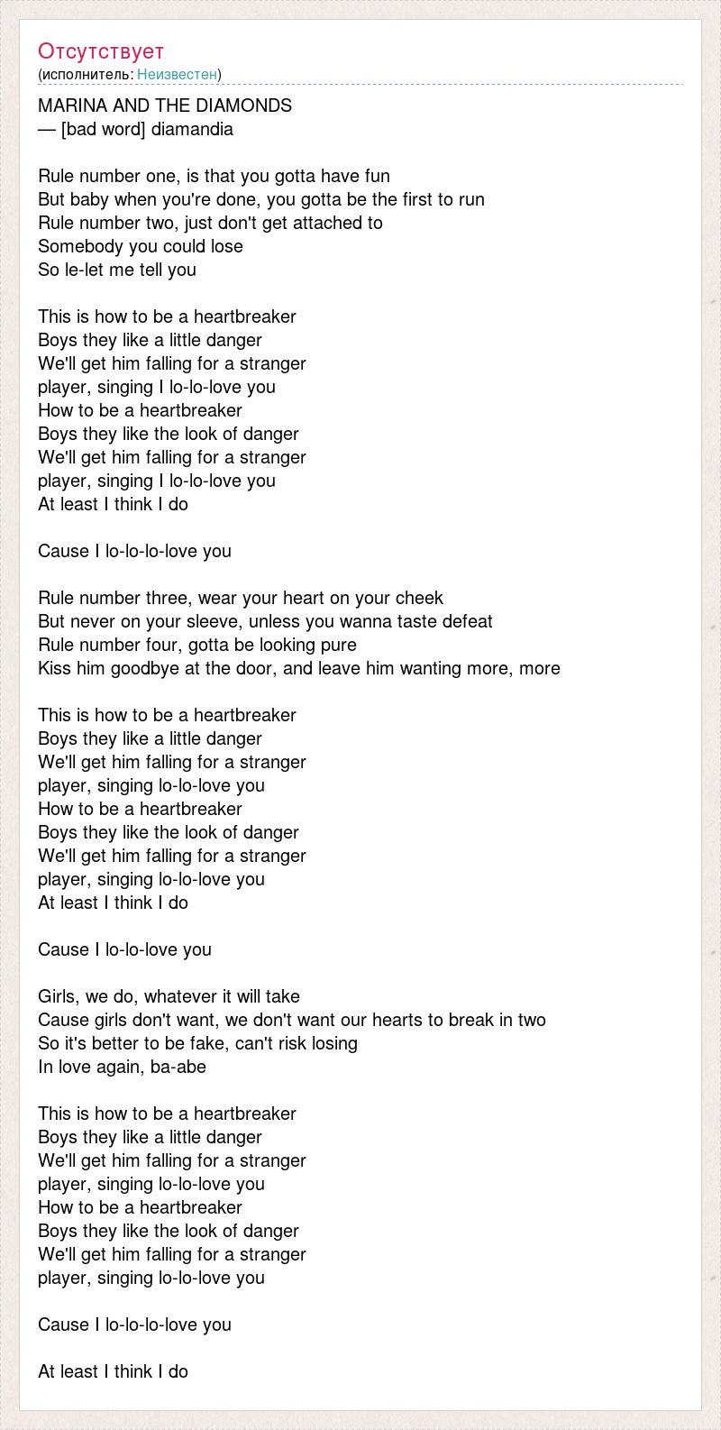 MARINA AND THE DIAMONDS — [bad word] diamandia Rule number one, is that you gotta have fun But baby when you're done, you gotta be the first to run Rule number two, just don't get attached to Somebody you could lose So le-let me tell you This is how to be a heartbreaker Boys they like a little danger We'll get him falling for a stranger player, singing I lo-lo-love you How to be a heartbreaker Boys they like the look of danger We'll get him falling for a stranger player, singing I lo-lo-love you At least I think I do Cause I lo-lo-lo-love you Rule number three, wear your heart on your cheek But never on your sleeve, unless you wanna taste defeat Rule number four, gotta be looking pure Kiss him goodbye at the door, and leave him wanting more, more This is how to be a heartbreaker Boys they like a little danger We'll get him falling for a stranger player, singing lo-lo-love you How to be a heartbreaker Boys they like the look of danger We'll get him falling for a stranger player, singing lo-lo-love you At least I think I do Cause I lo-lo-love you Girls, we do, whatever it will take Cause girls don't want, we don't want our hearts to break in two So it's better to be fake, can't risk losing In love again, ba-abe This is how to be a heartbreaker Boys they like a little danger We'll get him falling for a stranger player, singing lo-lo-love you How to be a heartbreaker Boys they like the look of danger We'll get him falling for a stranger player, singing lo-lo-love you Cause I lo-lo-lo-love you At least I think I do