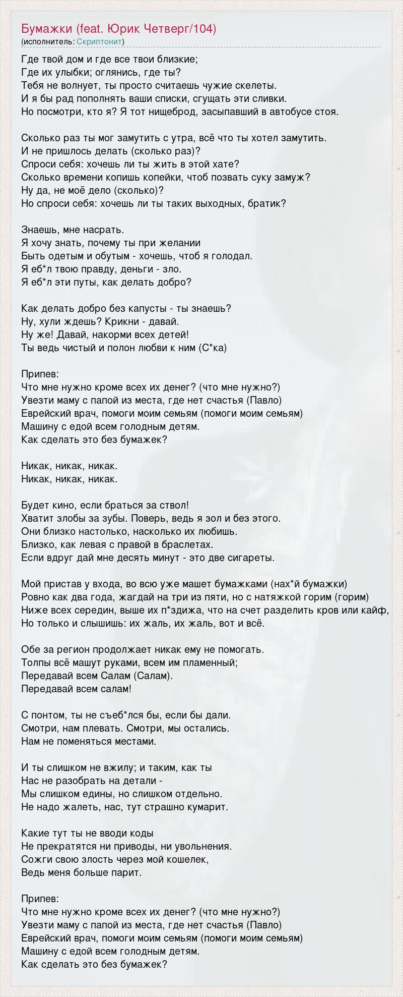 Где твой дом и где все твои близкие; Где их улыбки; оглянись, где ты? Тебя не волнует, ты просто считаешь чужие скелеты. И я бы рад пополнять ваши списки, сгущать эти сливки. Но посмотри, кто я? Я тот нищеброд, засыпавший в автобусе стоя. Сколько раз ты мог замутить с утра, всё что ты хотел замутить. И не пришлось делать (сколько раз)? Спроси себя: хочешь ли ты жить в этой хате? Сколько времени копишь копейки, чтоб позвать суку замуж? Ну да, не моё дело (сколько)? Но спроси себя: хочешь ли ты таких выходных, братик? Знаешь, мне насрать. Я хочу знать, почему ты при желании Быть одетым и обутым - хочешь, чтоб я голодал. Я еб*л твою правду, деньги - зло. Я еб*л эти путы, как делать добро? Как делать добро без капусты - ты знаешь? Ну, хули ждешь? Крикни - давай. Ну же! Давай, накорми всех детей! Ты ведь чистый и полон любви к ним (С*ка) Припев: Что мне нужно кроме всех их денег? (что мне нужно?) Увезти маму с папой из места, где нет счастья (Павло) Еврейский врач, помоги моим семьям (помоги моим семьям) Машину с едой всем голодным детям. Как сделать это без бумажек? Никак, никак, никак. Никак, никак, никак. Будет кино, если браться за ствол! Хватит злобы за зубы. Поверь, ведь я зол и без этого. Они близко настолько, насколько их любишь. Близко, как левая с правой в браслетах. Если вдруг дай мне десять минут - это две сигареты. Мой пристав у входа, во всю уже машет бумажками (нах*й бумажки) Ровно как два года, жагдай на три из пяти, но с натяжкой горим (горим) Ниже всех середин, выше их п*здижа, что на счет разделить кров или кайф, Но только и слышишь: их жаль, их жаль, вот и всё. Обе за регион продолжает никак ему не помогать. Толпы всё машут руками, всем им пламенный; Передавай всем Салам (Салам). Передавай всем салам! С понтом, ты не съеб*лся бы, если бы дали. Смотри, нам плевать. Смотри, мы остались. Нам не поменяться местами. И ты слишком не вжилу; и таким, как ты Нас не разобрать на детали - Мы слишком едины, но слишком отдельно. Не надо жалеть, нас, тут страшно кумарит. Какие тут ты не вводи коды Не прекратятся ни приводы, ни увольнения. Сожги свою злость через мой кошелек, Ведь меня больше парит. Припев: Что мне нужно кроме всех их денег? (что мне нужно?) Увезти маму с папой из места, где нет счастья (Павло) Еврейский врач, помоги моим семьям (помоги моим семьям) Машину с едой всем голодным детям. Как сделать это без бумажек?