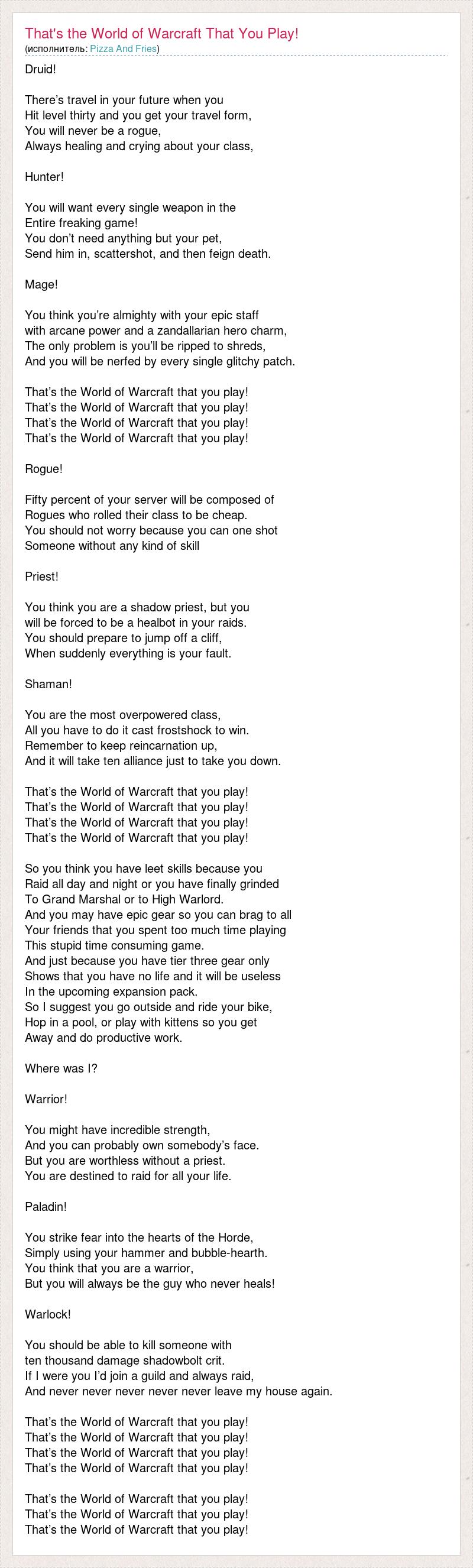 Druid! There’s travel in your future when you Hit level thirty and you get your travel form, You will never be a rogue, Always healing and crying about your class, Hunter! You will want every single weapon in the Entire freaking game! You don’t need anything but your pet, Send him in, scattershot, and then feign death. Mage! You think you’re almighty with your epic staff with arcane power and a zandallarian hero charm, The only problem is you’ll be ripped to shreds, And you will be nerfed by every single glitchy patch. That’s the World of Warcraft that you play! That’s the World of Warcraft that you play! That’s the World of Warcraft that you play! That’s the World of Warcraft that you play! Rogue! Fifty percent of your server will be composed of Rogues who rolled their class to be cheap. You should not worry because you can one shot Someone without any kind of skill Priest! You think you are a shadow priest, but you will be forced to be a healbot in your raids. You should prepare to jump off a cliff, When suddenly everything is your fault. Shaman! You are the most overpowered class, All you have to do it cast frostshock to win. Remember to keep reincarnation up, And it will take ten alliance just to take you down. That’s the World of Warcraft that you play! That’s the World of Warcraft that you play! That’s the World of Warcraft that you play! That’s the World of Warcraft that you play! So you think you have leet skills because you Raid all day and night or you have finally grinded To Grand Marshal or to High Warlord. And you may have epic gear so you can brag to all Your friends that you spent too much time playing This stupid time consuming game. And just because you have tier three gear only Shows that you have no life and it will be useless In the upcoming expansion pack. So I suggest you go outside and ride your bike, Hop in a pool, or play with kittens so you get Away and do productive work. Where was I? Warrior! You might have incredible strength, And you can probably own somebody’s face. But you are worthless without a priest. You are destined to raid for all your life. Paladin! You strike fear into the hearts of the Horde, Simply using your hammer and bubble-hearth. You think that you are a warrior, But you will always be the guy who never heals! Warlock! You should be able to kill someone with ten thousand damage shadowbolt crit. If I were you I’d join a guild and always raid, And never never never never never leave my house again. That’s the World of Warcraft that you play! That’s the World of Warcraft that you play! That’s the World of Warcraft that you play! That’s the World of Warcraft that you play! That’s the World of Warcraft that you play! That’s the World of Warcraft that you play! That’s the World of Warcraft that you play!