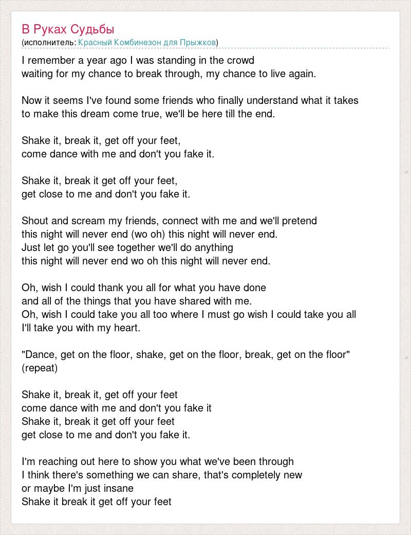 I remember a year ago I was standing in the crowd waiting for my chance to break through, my chance to live again. Now it seems I've found some friends who finally understand what it takes to make this dream come true, we'll be here till the end. Shake it, break it, get off your feet, come dance with me and don't you fake it. Shake it, break it get off your feet, get close to me and don't you fake it. Shout and scream my friends, connect with me and we'll pretend this night will never end (wo oh) this night will never end. Just let go you'll see together we'll do anything this night will never end wo oh this night will never end. Oh, wish I could thank you all for what you have done and all of the things that you have shared with me. Oh, wish I could take you all too where I must go wish I could take you all I'll take you with my heart. "Dance, get on the floor, shake, get on the floor, break, get on the floor" (repeat) Shake it, break it, get off your feet come dance with me and don't you fake it Shake it, break it get off your feet get close to me and don't you fake it. I'm reaching out here to show you what we've been through I think there's something we can share, that's completely new or maybe I'm just insane Shake it break it get off your feet