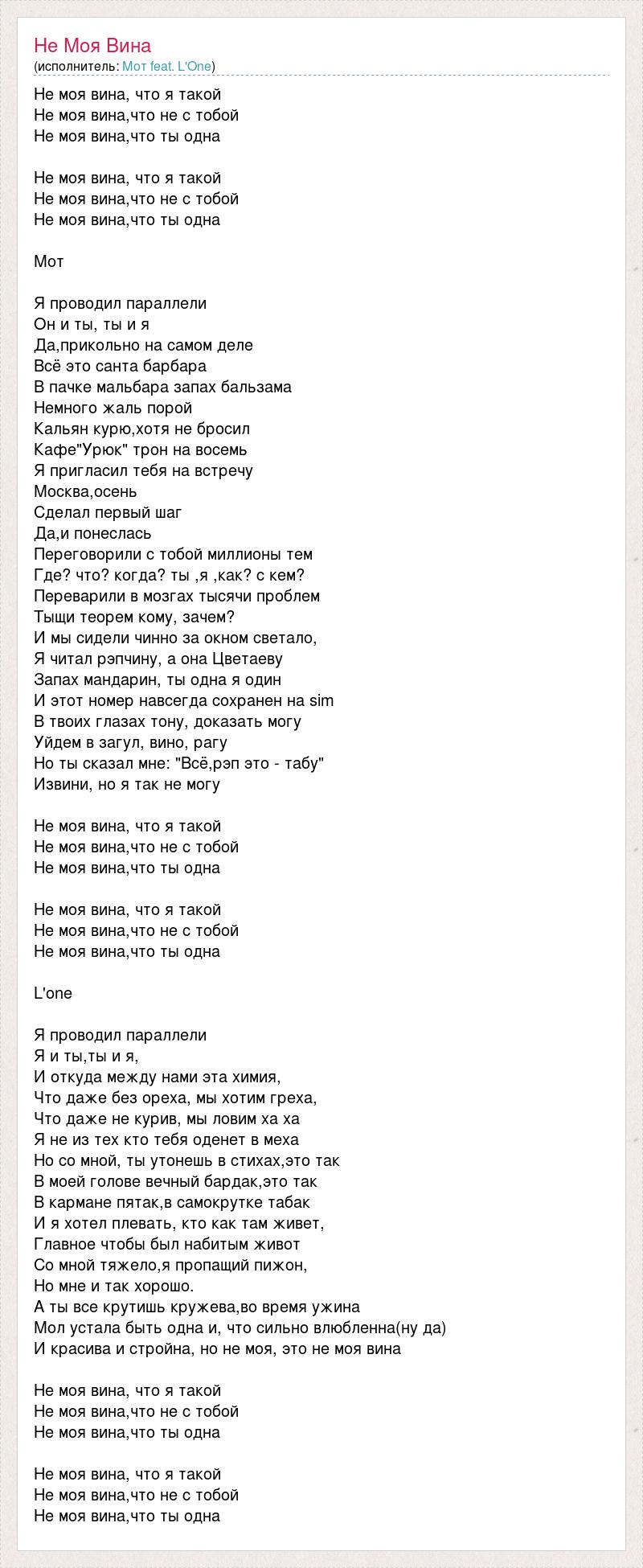 Не моя вина, что я такой Не моя вина,что не с тобой Не моя вина,что ты одна Не моя вина, что я такой Не моя вина,что не с тобой Не моя вина,что ты одна Мот Я проводил параллели Он и ты, ты и я Да,прикольно на самом деле Всё это санта барбара В пачке мальбара запах бальзама Немного жаль порой Кальян курю,хотя не бросил Кафе"Урюк" трон на восемь Я пригласил тебя на встречу Москва,осень Сделал первый шаг Да,и понеслась Переговорили с тобой миллионы тем Где? что? когда? ты ,я ,как? с кем? Переварили в мозгах тысячи проблем Тыщи теорем кому, зачем? И мы сидели чинно за окном светало, Я читал рэпчину, а она Цветаеву Запах мандарин, ты одна я один И этот номер навсегда сохранен на sim В твоих глазах тону, доказать могу Уйдем в загул, вино, рагу Но ты сказал мне: "Всё,рэп это - табу" Извини, но я так не могу Не моя вина, что я такой Не моя вина,что не с тобой Не моя вина,что ты одна Не моя вина, что я такой Не моя вина,что не с тобой Не моя вина,что ты одна L'one Я проводил параллели Я и ты,ты и я, И откуда между нами эта химия, Что даже без ореха, мы хотим греха, Что даже не курив, мы ловим ха ха Я не из тех кто тебя оденет в меха Но со мной, ты утонешь в стихах,это так В моей голове вечный бардак,это так В кармане пятак,в самокрутке табак И я хотел плевать, кто как там живет, Главное чтобы был набитым живот Со мной тяжело,я пропащий пижон, Но мне и так хорошо. А ты все крутишь кружева,во время ужина Мол устала быть одна и, что сильно влюбленна(ну да) И красива и стройна, но не моя, это не моя вина Не моя вина, что я такой Не моя вина,что не с тобой Не моя вина,что ты одна Не моя вина, что я такой Не моя вина,что не с тобой Не моя вина,что ты одна