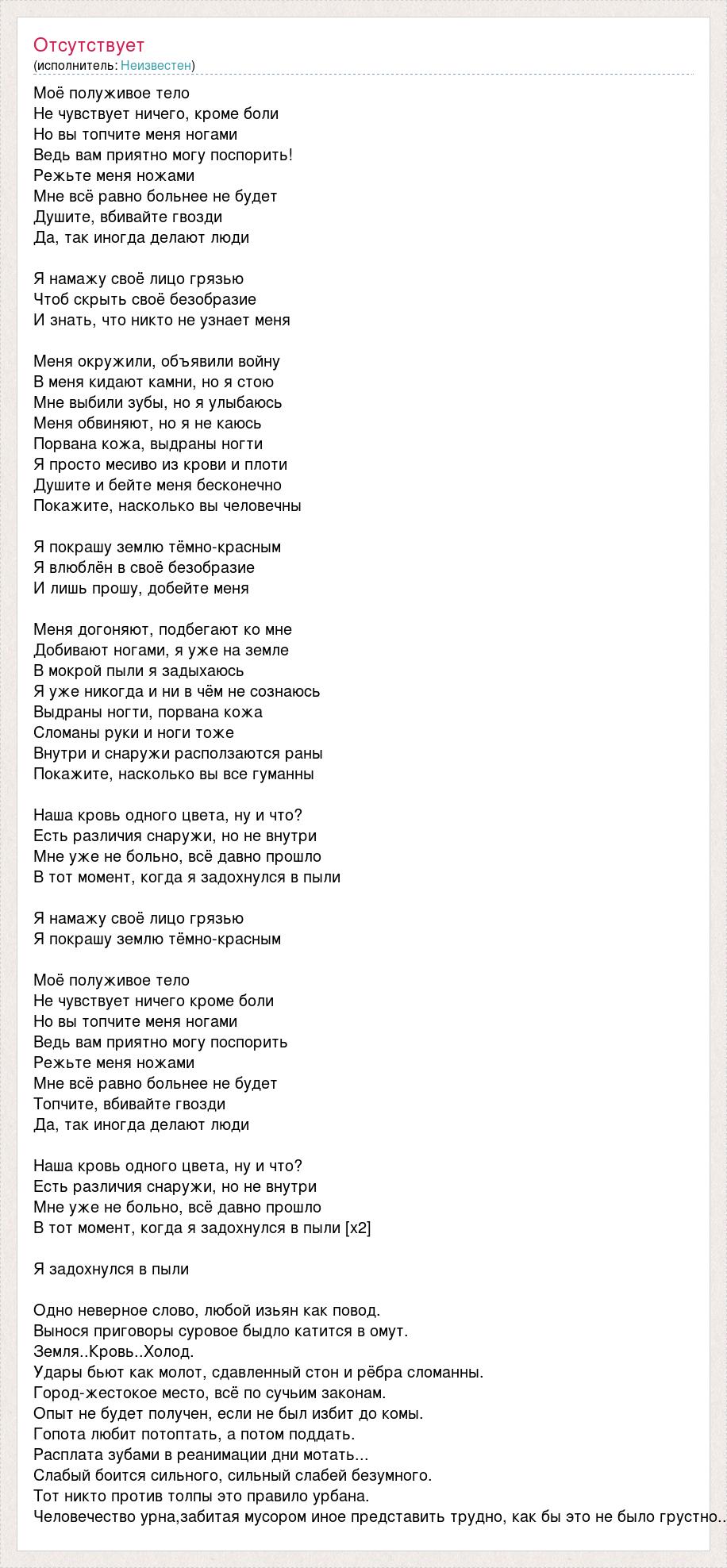 Моё полуживое тело Не чувствует ничего, кроме боли Но вы топчите меня ногами Ведь вам приятно могу поспорить! Режьте меня ножами Мне всё равно больнее не будет Душите, вбивайте гвозди Да, так иногда делают люди Я намажу своё лицо грязью Чтоб скрыть своё безобразие И знать, что никто не узнает меня Меня окружили, объявили войну В меня кидают камни, но я стою Мне выбили зубы, но я улыбаюсь Меня обвиняют, но я не каюсь Порвана кожа, выдраны ногти Я просто месиво из крови и плоти Душите и бейте меня бесконечно Покажите, насколько вы человечны Я покрашу землю тёмно-красным Я влюблён в своё безобразие И лишь прошу, добейте меня Меня догоняют, подбегают ко мне Добивают ногами, я уже на земле В мокрой пыли я задыхаюсь Я уже никогда и ни в чём не сознаюсь Выдраны ногти, порвана кожа Сломаны руки и ноги тоже Внутри и снаружи расползаются раны Покажите, насколько вы все гуманны Наша кровь одного цвета, ну и что? Есть различия снаружи, но не внутри Мне уже не больно, всё давно прошло В тот момент, когда я задохнулся в пыли Я намажу своё лицо грязью Я покрашу землю тёмно-красным Моё полуживое тело Не чувствует ничего кроме боли Но вы топчите меня ногами Ведь вам приятно могу поспорить Режьте меня ножами Мне всё равно больнее не будет Топчите, вбивайте гвозди Да, так иногда делают люди Наша кровь одного цвета, ну и что? Есть различия снаружи, но не внутри Мне уже не больно, всё давно прошло В тот момент, когда я задохнулся в пыли [x2] Я задохнулся в пыли Одно неверное слово, любой изьян как повод. Вынося приговоры суровое быдло катится в омут. Земля..Кровь..Холод. Удары бьют как молот, сдавленный стон и рёбра сломанны. Город-жестокое место, всё по сучьим законам. Опыт не будет получен, если не был избит до комы. Гопота любит потоптать, а потом поддать. Расплата зубами в реанимации дни мотать... Слабый боится сильного, сильный слабей безумного. Тот никто против толпы это правило урбана. Человечество урна,забитая мусором иное представить трудно, как бы это не было грустно..