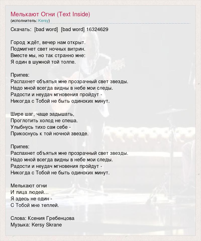 Скачать: [bad word] [bad word] 16324629 Город ждёт, вечер нам открыт. Подмигнет свет ночных витрин. Вместе мы, но так странно мне: Я один в шумной той толпе. Припев: Распахнет объятья мне прозрачный свет звезды. Надо мной всегда видны в небе мои следы. Радости и неудач мгновения пройдут - Никогда с Тобой не быть одиноких минут. Шире шаг, чаще задышать, Проглотить холод не спеша. Улыбнусь тихо сам себе - Прикоснусь к той ночной звезде. Припев: Распахнет объятья мне прозрачный свет звезды. Надо мной всегда видны в небе мои следы. Радости и неудач мгновения пройдут - Никогда с Тобой не быть одиноких минут. Мелькают огни И лица людей… Я здесь не один - С Тобой мне теплей. Слова: Ксения Гребенцова Музыка: Kersy Skrane