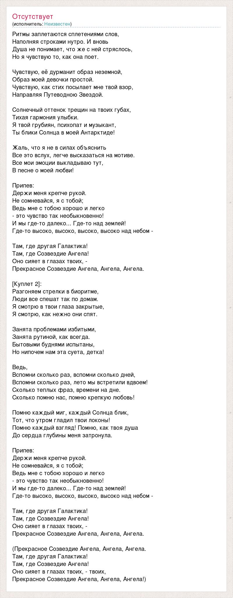 Ритмы заплетаются сплетениями слов, Наполняя строками нутро. И вновь Душа не понимает, что же с ней стряслось, Но я чувствую то, как она поет. Чувствую, её дурманит образ неземной, Образ моей девочки простой. Чувствую, как стих посылает мне твой взор, Направляя Путеводною Звездой. Солнечный оттенок трещин на твоих губах, Тихая гармония улыбки. Я твой грубиян, психопат и музыкант, Ты блики Солнца в моей Антарктиде! Жаль, что я не в силах объяснить Все это вслух, легче высказаться на мотиве. Все мои эмоции выкладываю тут, В песне о моей любви! Припев: Держи меня крепче рукой. Не сомневайся, я с тобой; Ведь мне с тобою хорошо и легко - это чувство так необыкновенно! И мы где-то далеко... Где-то над землей! Где-то высоко, высоко, высоко, высоко над небом - Там, где другая Галактика! Там, где Созвездие Ангела! Оно сияет в глазах твоих, - Прекрасное Созвездие Ангела, Ангела, Ангела. [Куплет 2]: Разгоняем стрелки в биоритме, Люди все спешат так по домам. Я смотрю в твои глаза закрытые, Я смотрю, как нежно они спят. Занята проблемами избитыми, Занята рутиной, как всегда. Бытовыми буднями испытаны, Но нипочем нам эта суета, детка! Ведь, Вспомни сколько раз, вспомни сколько дней, Вспомни сколько раз, лето мы встретили вдвоем! Сколько теплых фраз, времени на дне. Сколько помню нас, помню крепкую любовь! Помню каждый миг, каждый Солнца блик, Тот, что утром гладил твои локоны! Помню каждый взгляд! Помню, как твоя душа До сердца глубины меня затронула. Припев: Держи меня крепче рукой. Не сомневайся, я с тобой; Ведь мне с тобою хорошо и легко - это чувство так необыкновенно! И мы где-то далеко... Где-то над землей! Где-то высоко, высоко, высоко, высоко над небом - Там, где другая Галактика! Там, где Созвездие Ангела! Оно сияет в глазах твоих, - Прекрасное Созвездие Ангела, Ангела, Ангела. (Прекрасное Созвездие Ангела, Ангела, Ангела. Там, где другая Галактика! Там, где Созвездие Ангела! Оно сияет в глазах твоих, - твоих, Прекрасное Созвездие Ангела, Ангела, Ангела!)