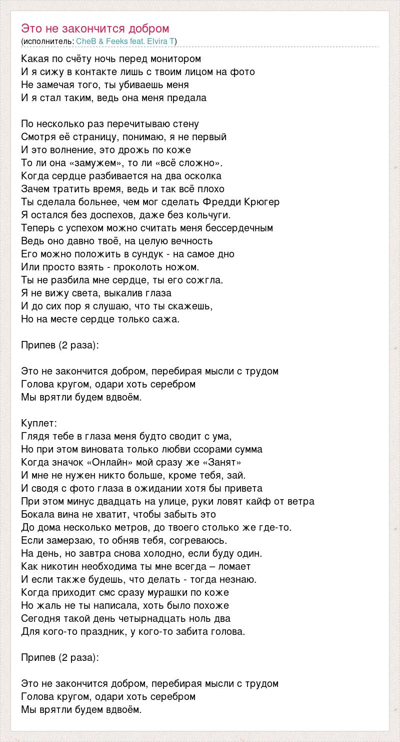 Какая по счёту ночь перед монитором И я сижу в контакте лишь с твоим лицом на фото Не замечая того, ты убиваешь меня И я стал таким, ведь она меня предала По несколько раз перечитываю стену Смотря её страницу, понимаю, я не первый И это волнение, это дрожь по коже То ли она «замужем», то ли «всё сложно». Когда сердце разбивается на два осколка Зачем тратить время, ведь и так всё плохо Ты сделала больнее, чем мог сделать Фредди Крюгер Я остался без доспехов, даже без кольчуги. Теперь с успехом можно считать меня бессердечным Ведь оно давно твоё, на целую вечность Его можно положить в сундук - на самое дно Или просто взять - проколоть ножом. Ты не разбила мне сердце, ты его сожгла. Я не вижу света, выкалив глаза И до сих пор я слушаю, что ты скажешь, Но на месте сердце только сажа. Припев (2 раза): Это не закончится добром, перебирая мысли с трудом Голова кругом, одари хоть серебром Мы врятли будем вдвоём. Куплет: Глядя тебе в глаза меня будто сводит с ума, Но при этом виновата только любви ссорами сумма Когда значок «Онлайн» мой сразу же «Занят» И мне не нужен никто больше, кроме тебя, зай. И сводя с фото глаза в ожидании хотя бы привета При этом минус двадцать на улице, руки ловят кайф от ветра Бокала вина не хватит, чтобы забыть это До дома несколько метров, до твоего столько же где-то. Если замерзаю, то обняв тебя, согреваюсь. На день, но завтра снова холодно, если буду один. Как никотин необходима ты мне всегда – ломает И если также будешь, что делать - тогда незнаю. Когда приходит смс сразу мурашки по коже Но жаль не ты написала, хоть было похоже Сегодня такой день четырнадцать ноль два Для кого-то праздник, у кого-то забита голова. Припев (2 раза): Это не закончится добром, перебирая мысли с трудом Голова кругом, одари хоть серебром Мы врятли будем вдвоём.