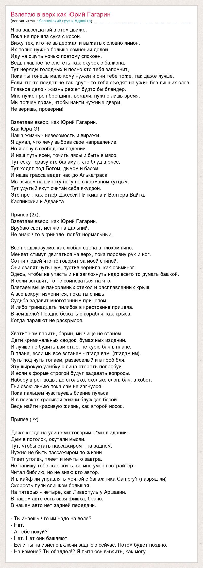 Я за завсегдатай в этом движе. Пока не пришла сука с косой. Вижу тех, кто не выдержал и выжатых словно лимон. Их полно нужно больше сомнений долой. Иду на ощупь ночью поэтому спокоен. Ведь главное не слететь, как окурок с балкона. Тут неряды голодных и полно кто тебя запомнит, Пока ты тонешь мало кому нужен и они тебе тоже, так даже лучше. Если что-то пойдет не так друг - то тебя съедят на ужин без лишних слов. Главное дело - жизнь режет будто бы блендер. Мне нужен рэп брендинг, врядли, нужно лишь время. Мы топчем грязь, чтобы найти нужные двери. Не веришь, проверим! Взлетаем вверх, как Юрий Гагарин. Как Юра G! Наша жизнь - невесомость и виражи. Я думал, что лечу выбрав свое направление. Но я лечу в свободном падении. И наш путь ясен, точить лясы и быть в мясо. Тут секут сразу кто баламут, кто блуд в рясе. Тут ходят под Богом, дымом и басом. И наша трасса ведет нас до Алькатраса. Мы живем на широку ногу но с карманом кутцым. Тут удутый якут считай себя якудзой. Это прет, как стаф Джесси Пинкмана и Волтера Вайта. Каспийский и Адвайта. Припев (2x): Взлетаем вверх, как Юрий Гагарин. Врубаю свет, меняю на дальний. Не знаю что в финале, полёт нормальный. Все предсказуемо, как любая сцена в плохом кино. Меняет стимул двигаться на верх, пока поровну рук и ног. Сотни людей что-то говорят за моей спиной. Они свалят чуть шум, пустив чернила, как осьминог. Здесь, чтобы не упасть и не заглохнуть надо всего то думать башкой. И если вставит, то не сомневаться на что. Влетаем выше панорамных стекол и расплавленных крыш. А все вокруг изменится, пока ты спишь. Судьба задавит многотонным прицепом. И либо тринадцать пилибов в крестовине прицела. В чем дело? Поздно бежать с корабля, как крыса. Когда парашют не раскрылся. Хватит нам парить, барин, мы чище не станем. Дети криминальных сводок, бумажных изданий. И лучше не будить вам стаю, не курю бля в плане. В плане, если мы все встанем - п*зда вам, (п*здам им). Чуть под чуть топаем, развеселый и в гроб бля. Эту широкую улыбку с лица стереть попробуй. И если в форме строгой будут задавать вопросы. Наберу в рот воды, до столько, сколько слон, бля, в хобот. Гни свою линию пока сам не загнулся. Пока пальцем чувствуешь биение пульса. И в поисках красивой жизни блуждая босой. Ведь найти красивую жизнь, как второй носок. Припев (2x) Даже когда на улице мы говорим - "мы в здании". Дым в потолок, окутали мысли. Тут, чтобы стать пассажиром - на заднем. Нужно не быть пассажиром по жизни. Тлеет уголек, тлеет и мечты о завтра. Не напишу тебе, как жить, во мне умер гострайтер. Читал библию, но не знаю кто автор. И в кайф ли управлять мечтой с багажника Campry? (навряд ли) Скорость пули слишком большая. На пятерых - четыре, как Ливерпуль у Аршавин. В нашем авто есть своя фишка, брачо. В нашем авто нет задней передачи. - Ты знаешь что им надо на воле? - Нет. - А тебе похуй? - Нет. Нет они башляют. - Если ты на измене включи заднюю сейчас. Потом будет поздно. - На измене? Ты обалдел!? Я пытаюсь выжить, как могу...