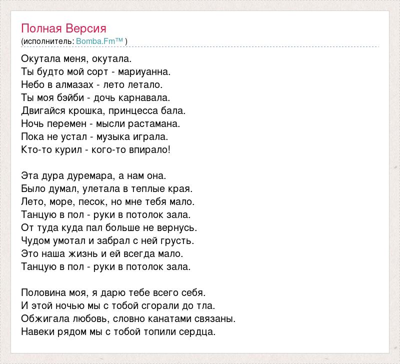 Окутала меня, окутала. Ты будто мой сорт - мариуанна. Небо в алмазах - лето летало. Ты моя бэйби - дочь карнавала. Двигайся крошка, принцесса бала. Ночь перемен - мысли растамана. Пока не устал - музыка играла. Кто-то курил - кого-то впирало! Эта дура дуремара, а нам она. Было думал, улетала в теплые края. Лето, море, песок, но мне тебя мало. Танцую в пол - руки в потолок зала. От туда куда пал больше не вернусь. Чудом умотал и забрал с ней грусть. Это наша жизнь и ей всегда мало. Танцую в пол - руки в потолок зала. Половина моя, я дарю тебе всего себя. И этой ночью мы с тобой сгорали до тла. Обжигала любовь, словно канатами связаны. Навеки рядом мы с тобой топили сердца.
