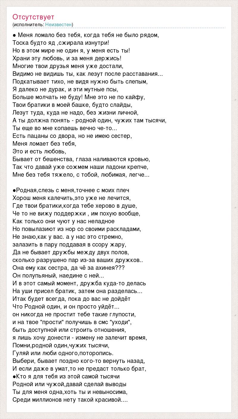 ● Меня ломало без тебя, когда тебя не было рядом, Тоска будто яд ,сжирала изнутри! Но в этом мире не один я, у меня есть ты! Храни эту любовь, и за меня держись! Многие твои друзья меня уже достали, Видимо не видишь ты, как лезут после расставания... Подкатывает тихо, не видя нужно быть слепым, Я далеко не дурак, и эти мутные псы, Больше молчать не буду! Мне это не по кайфу, Твои братики в моей башке, будто слайды, Лезут туда, куда не надо, без жизни личной, А ты должна понять - родной один, чужих там тысячи, Ты еще во мне копаешь вечно че-то... Есть пацаны со двора, но не имею сестер, Меня ломает без тебя, Это и есть любовь, Бывает от бешенства, глаза наливаются кровью, Так что давай уже сожмем наши ладони крепче, Мне без тебя тяжело, с тобой, любимая, легче... ●Родная,слезь с меня,точнее с моих плеч Хорош меня калечить,это уже не лечится, Где твои братики,когда тебе херово в душе, Че то не вижу поддержки , им похую вообще, Как только они чуют у нас неладное Но повылазиют из нор со своими раскладами, Не знаю,как у вас. а у нас это стремно, залазить в пару поддавая в ссору жару, Да не бывает дружбы между двух полов, сколько разрушено пар из-за ваших дружков.. Она ему как сестра, да чё за ахинея??? Он полупьяный, наедине с ней... И в этот самый момент, дружба куда-то делась На уши присел братик, затем она разделась... Итак будет всегда, пока до вас не дойдёт Что Родной один, и он просто уйдёт... он никогда не простит тебе такие глупости, и на твое "прости" получишь в смс "уходи", быть доступной или строить отношения, я лишь хочу донести - измену не залечит время, Помни,родной один,чужих тысячи, Гуляй или люби одного,поторопись. Выбери, бывает поздно кого-то вернуть назад, И если даже в умат,то не предаст только брат, ●Кто я для тебя из этой самой тысячи Родной или чужой,давай сделай выводы Ты для меня одна,хоть ты и невыносима, Среди миллионов нету такой красивой....