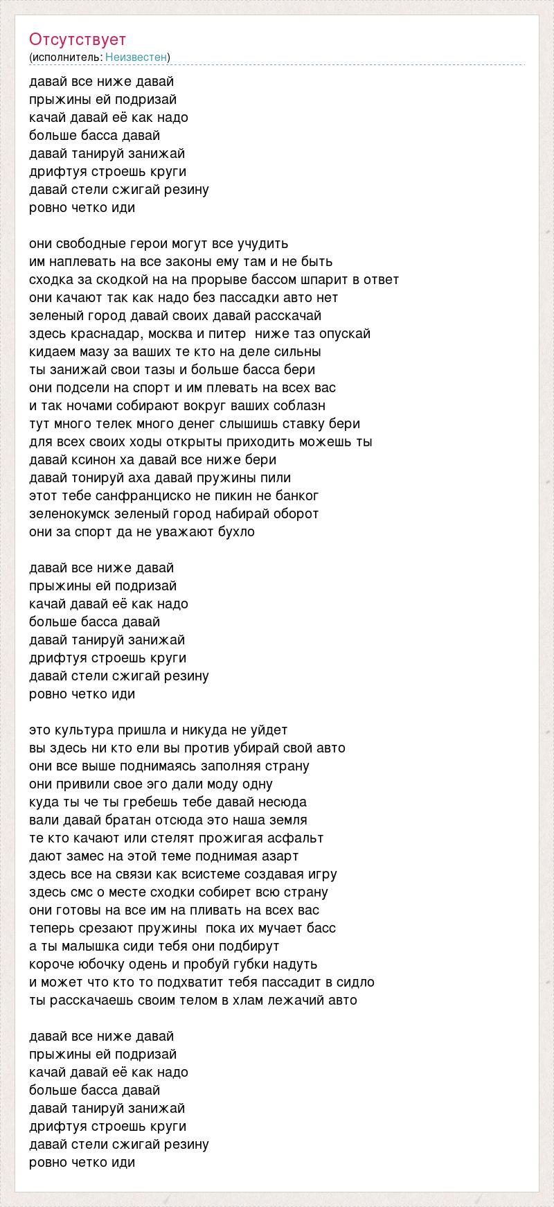 давай все ниже давай прыжины ей подризай качай давай её как надо больше басса давай давай танируй занижай дрифтуя строешь круги давай стели сжигай резину ровно четко иди они свободные герои могут все учудить им наплевать на все законы ему там и не быть сходка за скодкой на на прорыве бассом шпарит в ответ они качают так как надо без пассадки авто нет зеленый город давай своих давай расскачай здесь краснадар, москва и питер ниже таз опускай кидаем мазу за ваших те кто на деле сильны ты занижай свои тазы и больше басса бери они подсели на спорт и им плевать на всех вас и так ночами собирают вокруг ваших соблазн тут много телек много денег слышишь ставку бери для всех своих ходы открыты приходить можешь ты давай ксинон ха давай все ниже бери давай тонируй аха давай пружины пили этот тебе санфранциско не пикин не банког зеленокумск зеленый город набирай оборот они за спорт да не уважают бухло давай все ниже давай прыжины ей подризай качай давай её как надо больше басса давай давай танируй занижай дрифтуя строешь круги давай стели сжигай резину ровно четко иди это культура пришла и никуда не уйдет вы здесь ни кто ели вы против убирай свой авто они все выше поднимаясь заполняя страну они привили свое эго дали моду одну куда ты че ты гребешь тебе давай несюда вали давай братан отсюда это наша земля те кто качают или стелят прожигая асфальт дают замес на этой теме поднимая азарт здесь все на связи как всистеме создавая игру здесь смс о месте сходки собирет всю страну они готовы на все им на пливать на всех вас теперь срезают пружины пока их мучает басс а ты малышка сиди тебя они подбирут короче юбочку одень и пробуй губки надуть и может что кто то подхватит тебя пассадит в сидло ты расскачаешь своим телом в хлам лежачий авто давай все ниже давай прыжины ей подризай качай давай её как надо больше басса давай давай танируй занижай дрифтуя строешь круги давай стели сжигай резину ровно четко иди