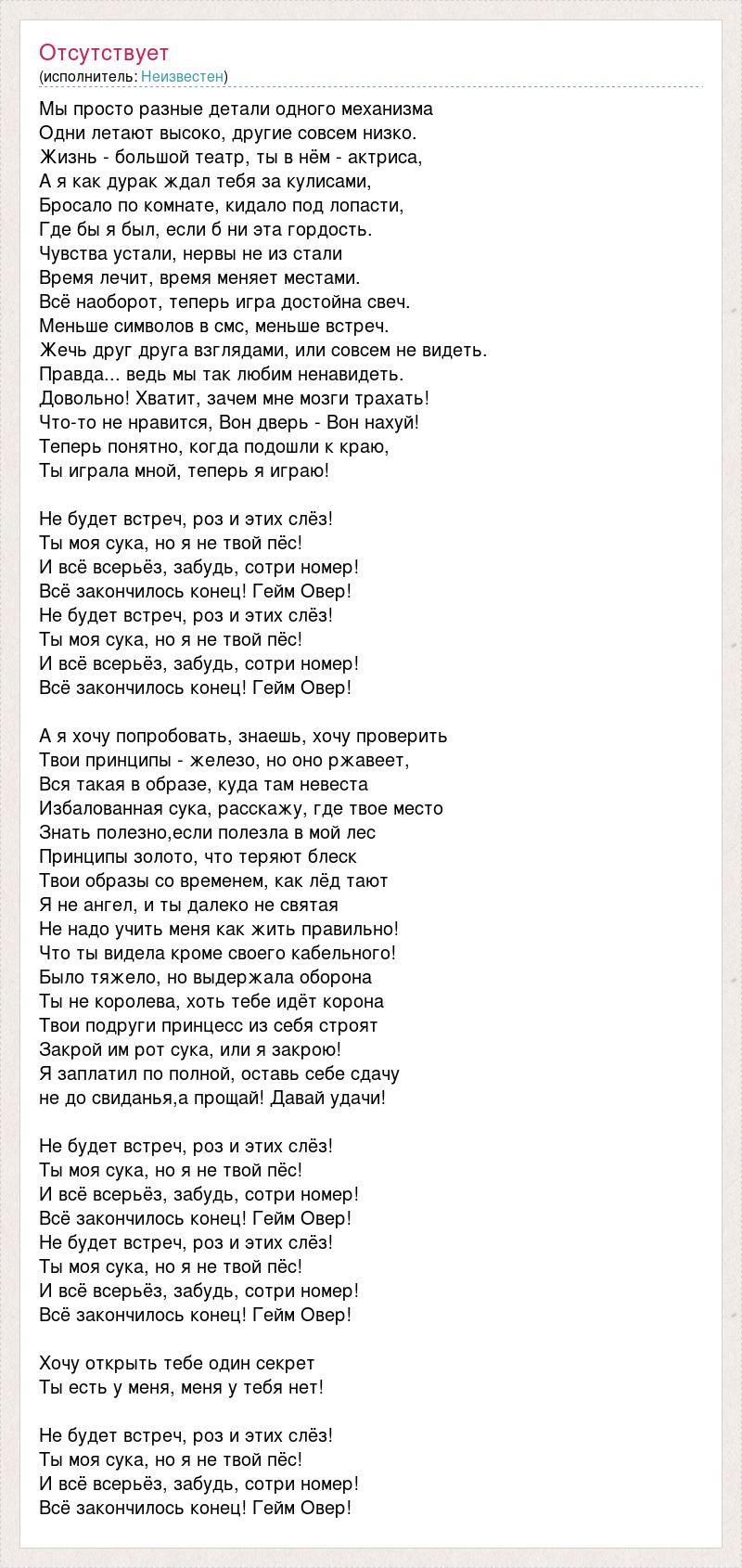 Мы просто разные детали одного механизма Одни летают высоко, другие совсем низко. Жизнь - большой театр, ты в нём - актриса, А я как дурак ждал тебя за кулисами, Бросало по комнате, кидало под лопасти, Где бы я был, если б ни эта гордость. Чувства устали, нервы не из стали Время лечит, время меняет местами. Всё наоборот, теперь игра достойна свеч. Меньше символов в смс, меньше встреч. Жечь друг друга взглядами, или совсем не видеть. Правда... ведь мы так любим ненавидеть. Довольно! Хватит, зачем мне мозги трахать! Что-то не нравится, Вон дверь - Вон нахуй! Теперь понятно, когда подошли к краю, Ты играла мной, теперь я играю! Не будет встреч, роз и этих слёз! Ты моя сука, но я не твой пёс! И всё всерьёз, забудь, сотри номер! Всё закончилось конец! Гейм Овер! Не будет встреч, роз и этих слёз! Ты моя сука, но я не твой пёс! И всё всерьёз, забудь, сотри номер! Всё закончилось конец! Гейм Овер! А я хочу попробовать, знаешь, хочу проверить Твои принципы - железо, но оно ржавеет, Вся такая в образе, куда там невеста Избалованная сука, расскажу, где твое место Знать полезно,если полезла в мой лес Принципы золото, что теряют блеск Твои образы со временем, как лёд тают Я не ангел, и ты далеко не святая Не надо учить меня как жить правильно! Что ты видела кроме своего кабельного! Было тяжело, но выдержала оборона Ты не королева, хоть тебе идёт корона Твои подруги принцесс из себя строят Закрой им рот сука, или я закрою! Я заплатил по полной, оставь себе сдачу не до свиданья,а прощай! Давай удачи! Не будет встреч, роз и этих слёз! Ты моя сука, но я не твой пёс! И всё всерьёз, забудь, сотри номер! Всё закончилось конец! Гейм Овер! Не будет встреч, роз и этих слёз! Ты моя сука, но я не твой пёс! И всё всерьёз, забудь, сотри номер! Всё закончилось конец! Гейм Овер! Хочу открыть тебе один секрет Ты есть у меня, меня у тебя нет! Не будет встреч, роз и этих слёз! Ты моя сука, но я не твой пёс! И всё всерьёз, забудь, сотри номер! Всё закончилось конец! Гейм Овер!