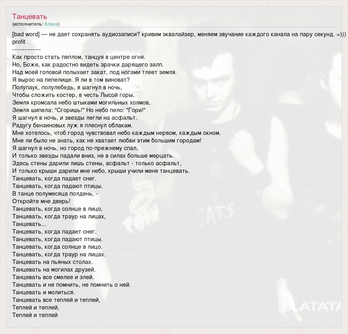 [bad word] — не дает сохранять аудиозаписи? кривим эквалайзер, меняем звучание каждого канала на пару секунд. =))) profit -------------- Как просто стать пеплом, танцуя в центре огня. Но, Боже, как радостно видеть зрачки дарящего залп. Над моей головой полыхает закат, под ногами тлеет земля. Я вырос на пепелище. Я ли в том виноват? Полупаук, полулебедь, я шагнул в ночь, Чтобы сложить костер, в честь Лысой горы. Земля кромсала небо штыками могильных холмов, Земля шипела: "Сгоришь!" Но небо пело: "Гори!" Я шагнул в ночь, и звезды легли на асфальт. Радугу бензиновых луж я плеснул облакам. Мне хотелось, чтоб город чувствовал небо каждым нервом, каждым окном. Мне ли было не знать, как не хватает любви этим большим городам! Я шагнул в ночь, но город по-прежнему спал, И только звезды падали вниз, не в силах больше мерцать. Здесь стены дарили лишь стены, асфальт - только асфальт, И только крыши дарили мне небо, крыши учили меня танцевать. Танцевать, когда падает снег. Танцевать, когда падают птицы. В танце полумесяца полдень, - Откройте мне дверь! Танцевать, когда солнце в лицо, Танцевать, когда траур на лицах, Танцевать... Танцевать, когда падает снег. Танцевать, когда падают птицы. Танцевать, когда солнце в лицо. Танцевать, когда траур на лицах. Танцевать на пьяных столах. Танцевать на могилах друзей. Танцевать все смелее и злей. Танцевать и не помнить, не помнить о ней. Танцевать и молиться. Танцевать все теплей и теплей, Теплей и теплей, Теплей и теплей