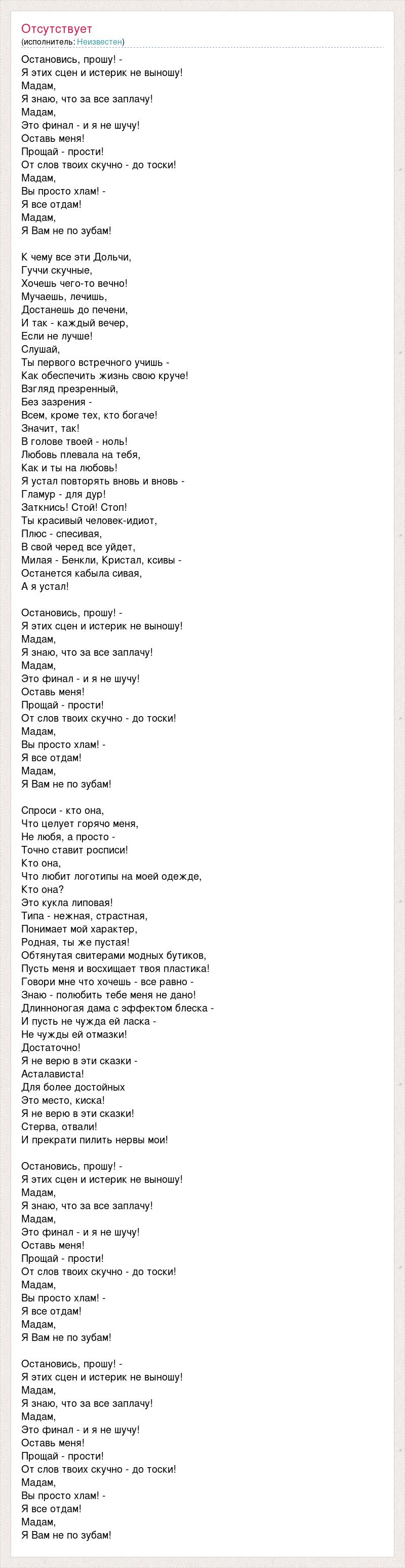 Остановись, прошу! - Я этих сцен и истерик не выношу! Мадам, Я знаю, что за все заплачу! Мадам, Это финал - и я не шучу! Оставь меня! Прощай - прости! От слов твоих скучно - до тоски! Мадам, Вы просто хлам! - Я все отдам! Мадам, Я Вам не по зубам! К чему все эти Дольчи, Гуччи скучные, Хочешь чего-то вечно! Мучаешь, лечишь, Достанешь до печени, И так - каждый вечер, Если не лучше! Слушай, Ты первого встречного учишь - Как обеспечить жизнь свою круче! Взгляд презренный, Без зазрения - Всем, кроме тех, кто богаче! Значит, так! В голове твоей - ноль! Любовь плевала на тебя, Как и ты на любовь! Я устал повторять вновь и вновь - Гламур - для дур! Заткнись! Стой! Стоп! Ты красивый человек-идиот, Плюс - спесивая, В свой черед все уйдет, Милая - Бенкли, Кристал, ксивы - Останется кабыла сивая, А я устал! Остановись, прошу! - Я этих сцен и истерик не выношу! Мадам, Я знаю, что за все заплачу! Мадам, Это финал - и я не шучу! Оставь меня! Прощай - прости! От слов твоих скучно - до тоски! Мадам, Вы просто хлам! - Я все отдам! Мадам, Я Вам не по зубам! Спроси - кто она, Что целует горячо меня, Не любя, а просто - Точно ставит росписи! Кто она, Что любит логотипы на моей одежде, Кто она? Это кукла липовая! Типа - нежная, страстная, Понимает мой характер, Родная, ты же пустая! Обтянутая свитерами модных бутиков, Пусть меня и восхищает твоя пластика! Говори мне что хочешь - все равно - Знаю - полюбить тебе меня не дано! Длинноногая дама с эффектом блеска - И пусть не чужда ей ласка - Не чужды ей отмазки! Достаточно! Я не верю в эти сказки - Асталависта! Для более достойных Это место, киска! Я не верю в эти сказки! Стерва, отвали! И прекрати пилить нервы мои! Остановись, прошу! - Я этих сцен и истерик не выношу! Мадам, Я знаю, что за все заплачу! Мадам, Это финал - и я не шучу! Оставь меня! Прощай - прости! От слов твоих скучно - до тоски! Мадам, Вы просто хлам! - Я все отдам! Мадам, Я Вам не по зубам! Остановись, прошу! - Я этих сцен и истерик не выношу! Мадам, Я знаю, что за все заплачу! Мадам, Это финал - и я не шучу! Оставь меня! Прощай - прости! От слов твоих скучно - до тоски! Мадам, Вы просто хлам! - Я все отдам! Мадам, Я Вам не по зубам!