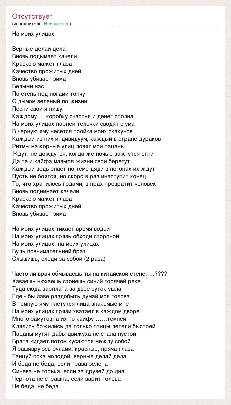 На моих улицах Верные делай дела Вновь подымает качели Краскою мажет глаза Качество прожитых дней Вновь убивает зима Белыми нас ……… По степь под ногами топчу С дымом зеленый по жизни Песни свои я пишу Каждому … коробку счастья и денег сполна На моих улицах парней телочки сводят с ума В черную яму несется тройка моих скакунов Каждый из них индивидуум, каждый в стране дураков Ритмы мажорные улиц ловят мои пацаны Ждут, не дождутся, когда же ночью зажгутся огни Да те и кайфа мазыря жизни свои берегут Каждый ведь знает по теме дяди в погонах их ждут Пусть не боятся, но скоро в раз инаступит конец То, что хранилось годами, в прах превратит человек Вновь поднимает качели Краскою мажет глаза Качество прожитых дней Вновь убивает зима На моих улицах тикает время водой На моих улицах грязь обходи стороной На моих улицах, на моих улицах Будь повнимательней брат Слышишь, следи за собой (2 раза) Часто ли врач обмываешь ты на китайской стене…..???? Хаваешь нюхаешь стонешь синий горячей реке Туда сюда зарплата за двое суток ушла Где - бы лаве раздобыть думай моя голова В темную яму плетутся лица знакомые мне На моих улицах грязи хватает в каждом дворе Много замутов, а их по кайфу ……темней Клялись божились да только птицы летели быстрей Пацаны мутят дабы движуха не стала пустой Брата кидает потом кусаются между собой Я зашивруюсь очками, красные, пряча глаза Танцуй пока молодой, верные делай дела И беда не беда, если трава зелена Синева не горька, если за друзей до дна Чернота не страшна, если варит голова Не беда, не беда…