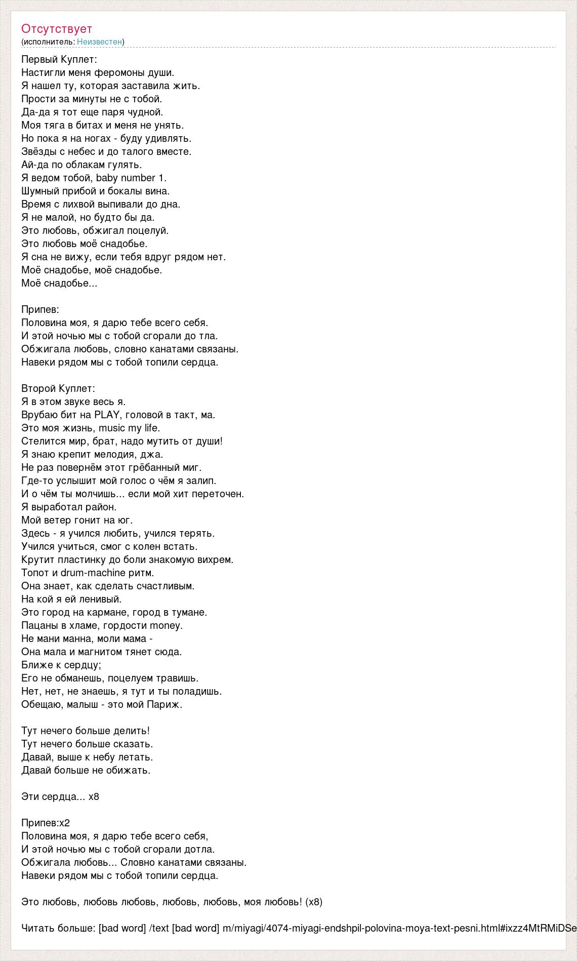 Первый Куплет: Настигли меня феромоны души. Я нашел ту, которая заставила жить. Прости за минуты не с тобой. Да-да я тот еще паря чудной. Моя тяга в битах и меня не унять. Но пока я на ногах - буду удивлять. Звёзды с небес и до талого вместе. Ай-да по облакам гулять. Я ведом тобой, baby number 1. Шумный прибой и бокалы вина. Время с лихвой выпивали до дна. Я не малой, но будто бы да. Это любовь, обжигал поцелуй. Это любовь моё снадобье. Я сна не вижу, если тебя вдруг рядом нет. Моё снадобье, моё снадобье. Моё снадобье... Припев: Половина моя, я дарю тебе всего себя. И этой ночью мы с тобой сгорали до тла. Обжигала любовь, словно канатами связаны. Навеки рядом мы с тобой топили сердца. Второй Куплет: Я в этом звуке весь я. Врубаю бит на PLAY, головой в такт, ма. Это моя жизнь, music my life. Стелится мир, брат, надо мутить от души! Я знаю крепит мелодия, джа. Не раз повернём этот грёбанный миг. Где-то услышит мой голос о чём я залип. И о чём ты молчишь... если мой хит переточен. Я выработал район. Мой ветер гонит на юг. Здесь - я учился любить, учился терять. Учился учиться, смог с колен встать. Крутит пластинку до боли знакомую вихрем. Топот и drum-machine ритм. Она знает, как сделать счастливым. На кой я ей ленивый. Это город на кармане, город в тумане. Пацаны в хламе, гордости money. Не мани манна, моли мама - Она мала и магнитом тянет сюда. Ближе к сердцу; Его не обманешь, поцелуем травишь. Нет, нет, не знаешь, я тут и ты поладишь. Обещаю, малыш - это мой Париж. Тут нечего больше делить! Тут нечего больше сказать. Давай, выше к небу летать. Давай больше не обижать. Эти сердца... x8 Припев:x2 Половина моя, я дарю тебе всего себя, И этой ночью мы с тобой сгорали дотла. Обжигала любовь... Словно канатами связаны. Навеки рядом мы с тобой топили сердца. Это любовь, любовь любовь, любовь, любовь, моя любовь! (х8) Читать больше: [bad word] /text [bad word] m/miyagi/4074-miyagi-endshpil-polovina-moya-text-pesni.html#ixzz4MtRMiDSe